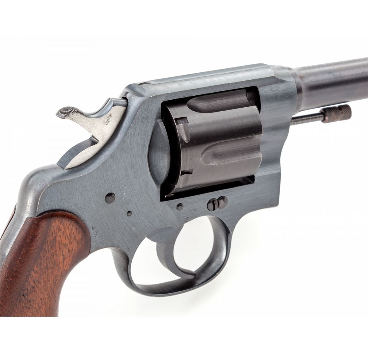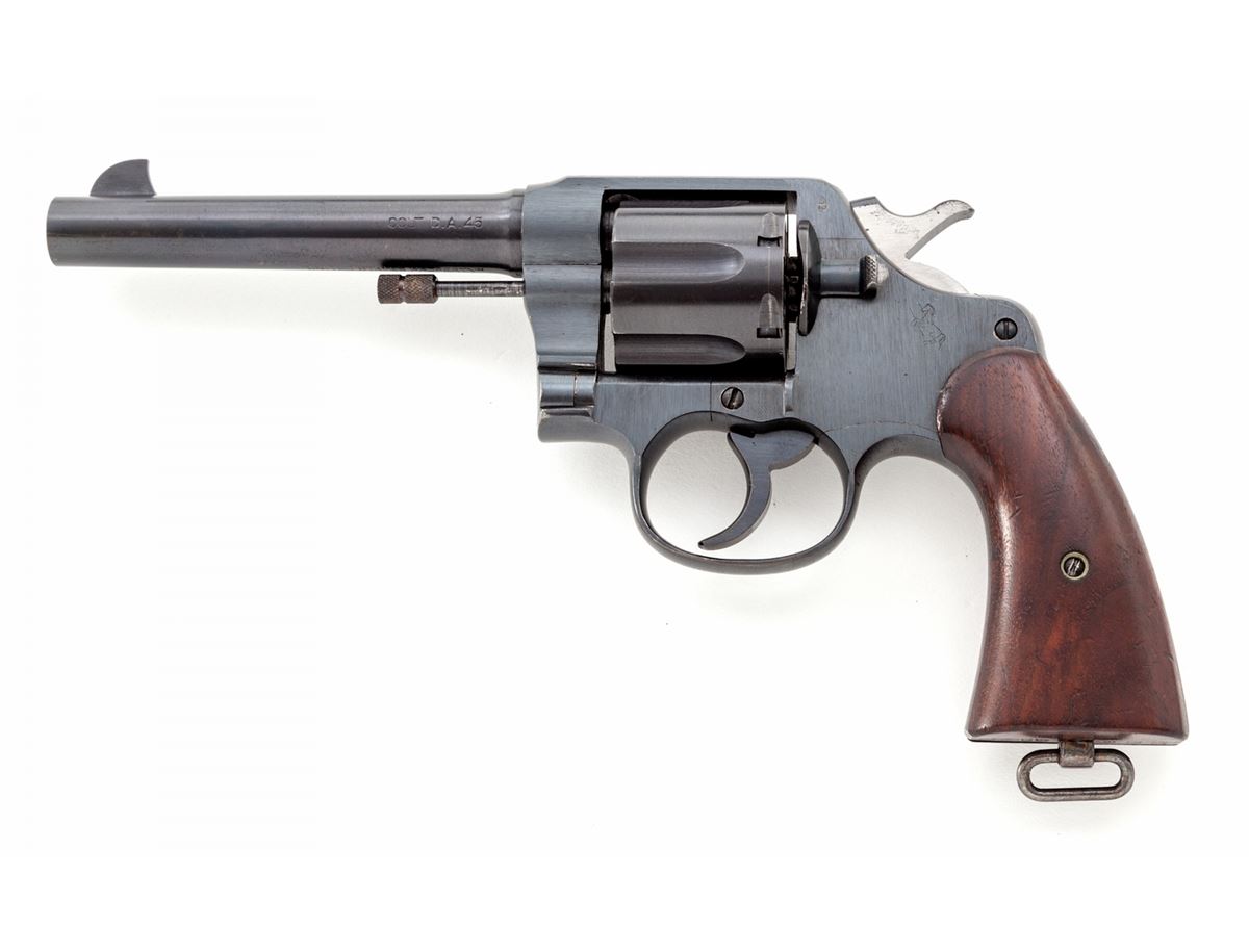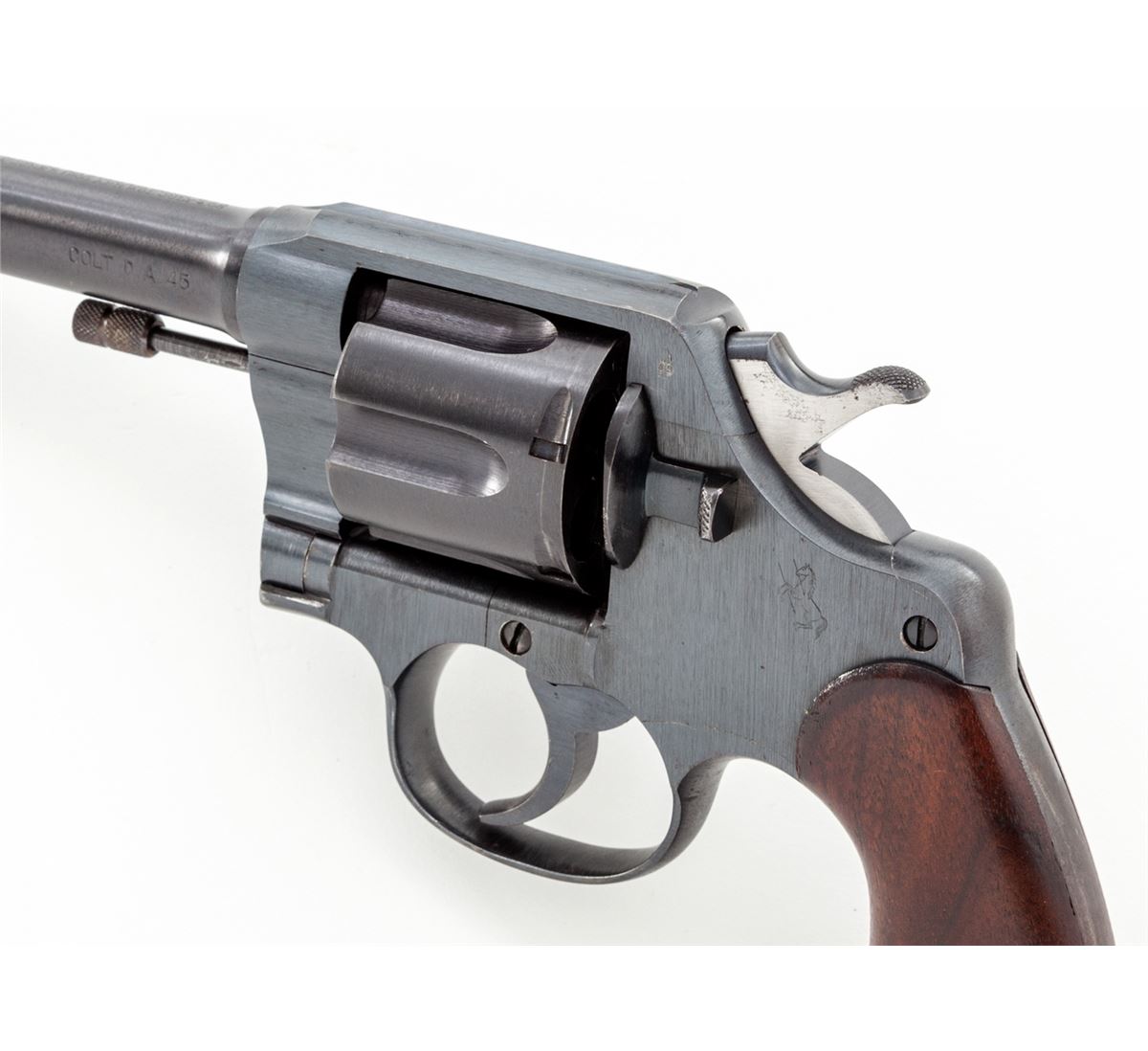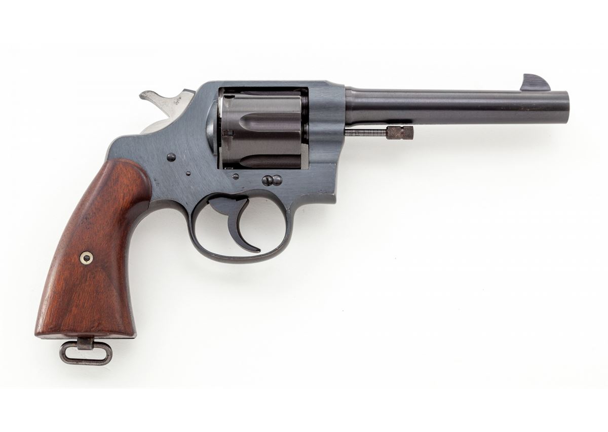 Colt U.S. Model 1917 Double Action Revolver, butt numbered #69824; crane #224152, .45 ACP cal., 5-1/2'' barrel, blue finish, smooth walnut grips,, bottom of barrel marked ''United States Property'', with small eaglehead/''S 19'' inspector's mark above cylinder latch. Condition is excellent retaining approx. 98% blue, with some light wear and thinning and screw slot, most predominantly the grip screw. Grips with light impressions. Crisp action, bright bore. Est.: $1,800-$2,400. (C&R/PPT)