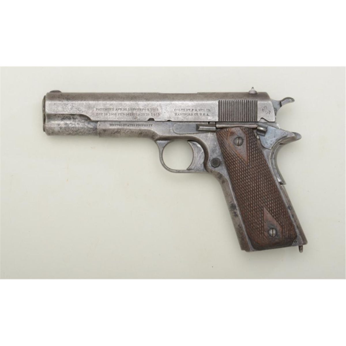 Colt U.S. Property Model 1911 semi-auto pistol, .45 cal., 5” barrel, checkered wood grips, no magazine, #112405. This gun is in overall good condition showing a grey patina with scattered spots of erosion and pin prick pitting, good bore, action and markings; worn grips with a very old loss to the right grip’s rear bottom area; lanyard ring remains on frame; uncleaned and somewhat rough but real and with barrel stamped “P” and “H”.Est.: $500-$1,000.