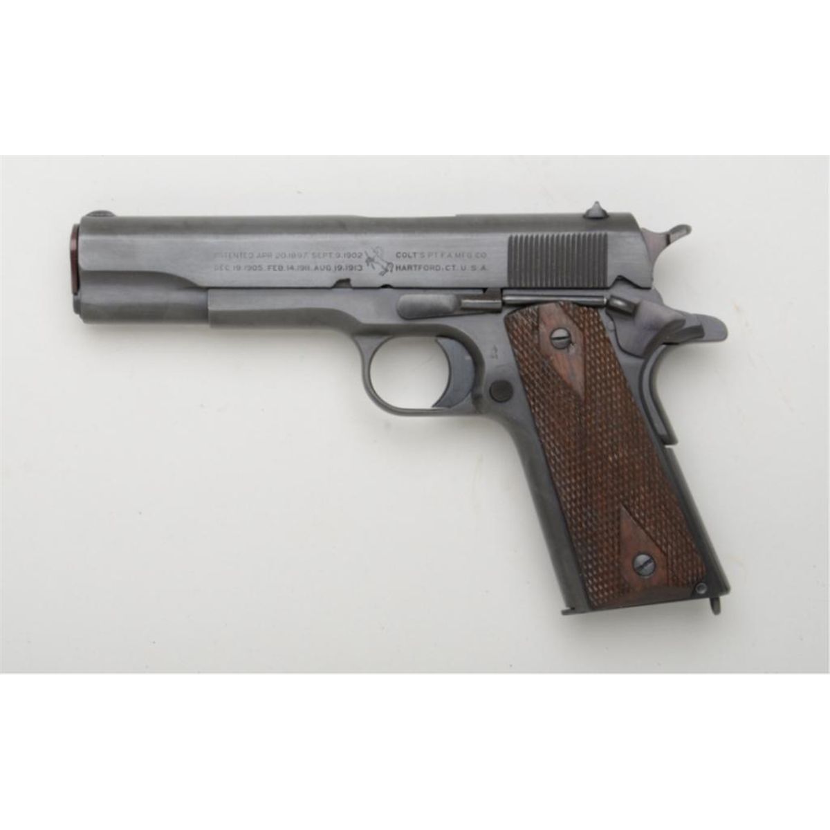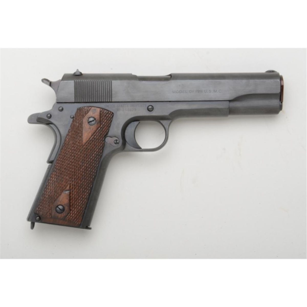 Colt U.S. Property Model 1911 semi-auto pistol, professionally restored and reworked by Dave Buehn with slide marked "Model of 1911 U.S.M.C.", .45 cal., 5" barrel, re-blued finish, checkered wood grips, #358829. Thisgun is in fine condition as restored showing the majority of its re-finish, very good bore, crisp action, very good wood grips. Est.: $900-$1,800.