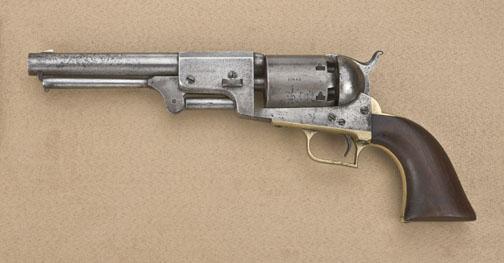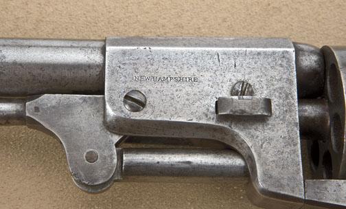 Colt U.S. martial Second Model Dragoon percussion revolver, .44 cal., 7-1/2” barrel, blue and case hardened finish, “New Hampshire”-marked on left side of barrel assembly above rammer retaining screw, woodgrips, #10460. This gun is in overall very good condition showing a grey patina on metal surfaces with some scattered spots of erosion and pin prick pitting with a section of heavier pitting on a portion of thecylinder; majority of cylinder scene remains including visible “W.L. Ormsby”; some faint traces of case color on rammer, sharp markings and all serial numbers are matching except the wedge which is numbered 451 and is in similar condition to the rest of this revolver; fine grips with strong traces of both cartouches on the grips; five of six safety pins remain on the back of the cylinder. An overall very nice NewHampshire-marked Second Model Dragoon. Estimate at less than 100 produced, very rare. Est.: $16,500-$32,000.
