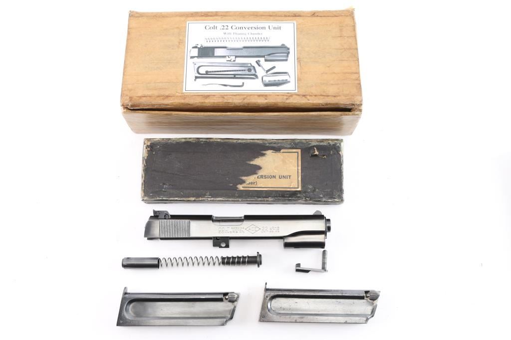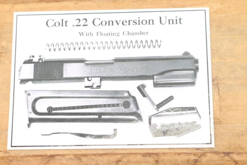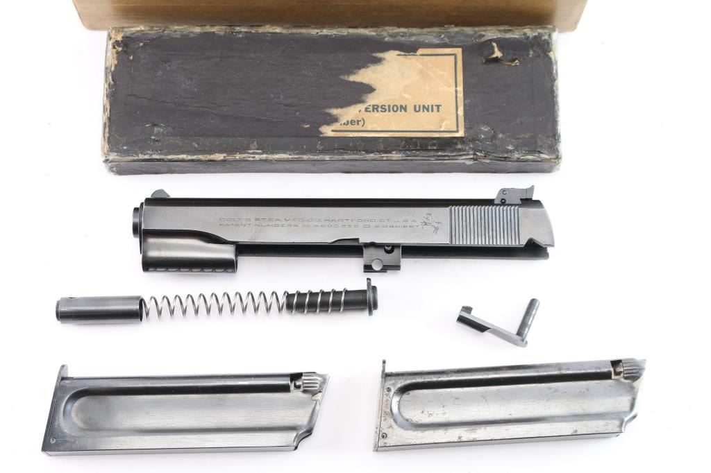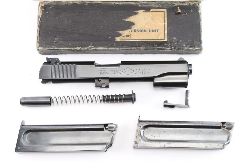 For government model. Adjustable sights and .22 service model and correct early mag along with original instructions, box and extra mag (80% well used). 90-95% finish on unit, mag and small parts. Sharp and crisp. Box good with label mostly missing on top but fully intact on end. Desirable.