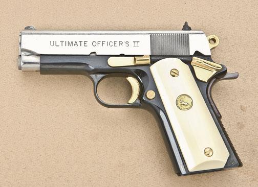 Colt Ultimate Officer’s II compact semi-auto pistol, .45 cal., 3-3/4” barrel, nickel finish to slide, black finish to frame, gold finish accents to trigger, hammer, safety, slide and magazine release (no magazine),gold Colt medallion faux ivory grips, #LHU245. This gun is in overall like new condition showing approx. 99%+ original finishes, fine bore, action, markings and grips. Purchased by Dave Chatfield Collectorfrom Colt Collector's Assoc. Auction Portland Oregon! Est.: $750-$1,500.