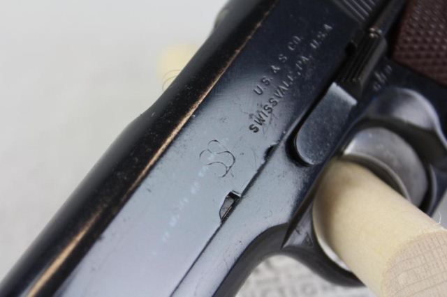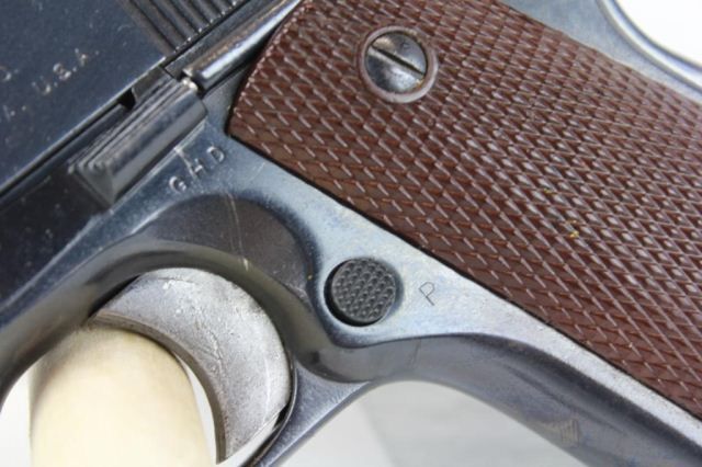 Colt M1911A1. Frame marked "UNITED STATES PROPERTY" & "M1911A1 U.S. ARMY" on RH side. LH side is stamped "GHD" just below slide release and "P" just above mag release. Trigger and original lower backstrap with lanyard loop are included. Union Switch & Signal slide is marked with USS logo on LH side and also marked "U.S. & S. CO. SWISSVALE, PA. US.A.". Barrel is marked "HS" (for High Standard) which would be the proper barrel match for the Union Switch.& Signal slide. Overall this WWII Pistol is in excellent condition.
