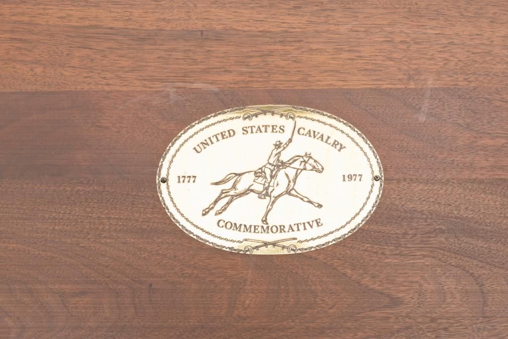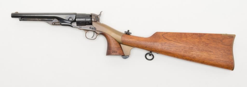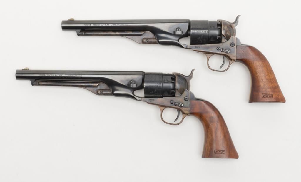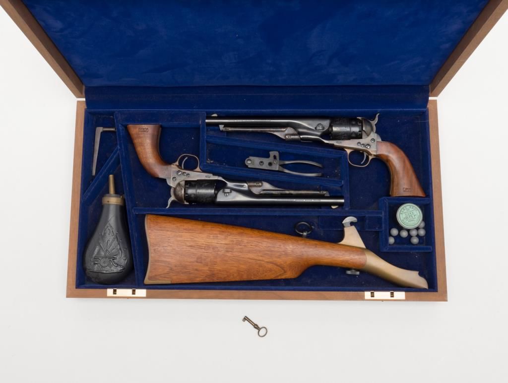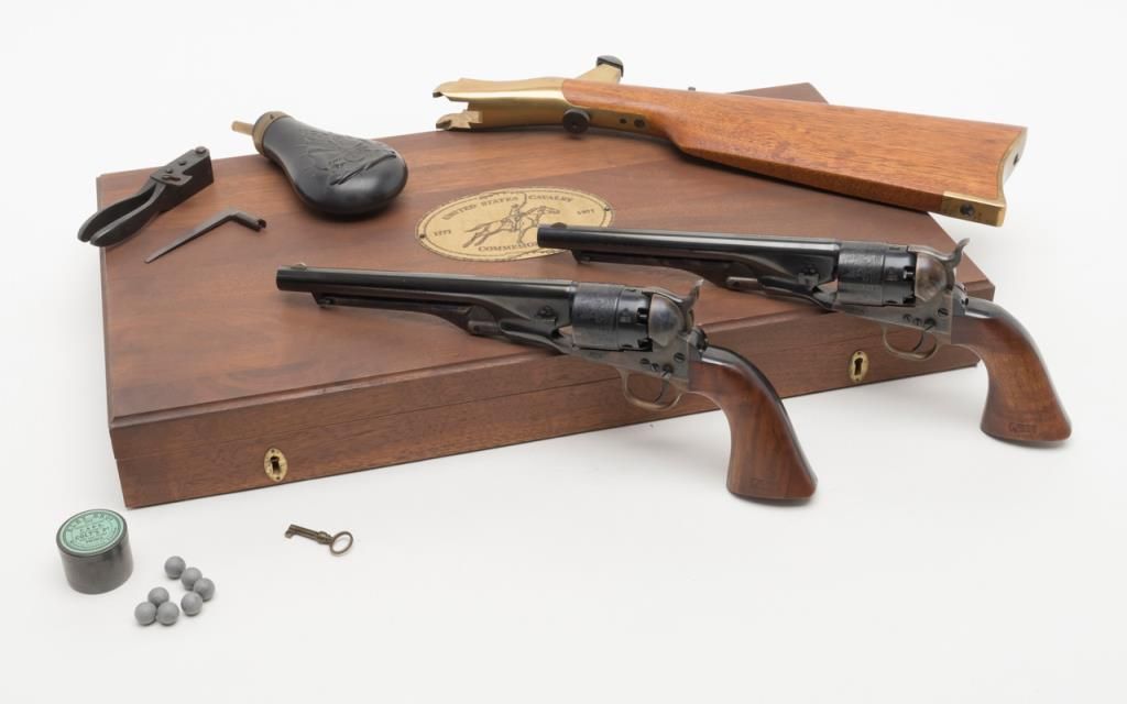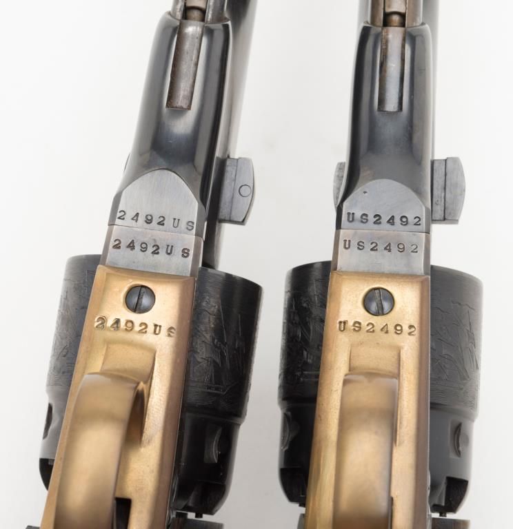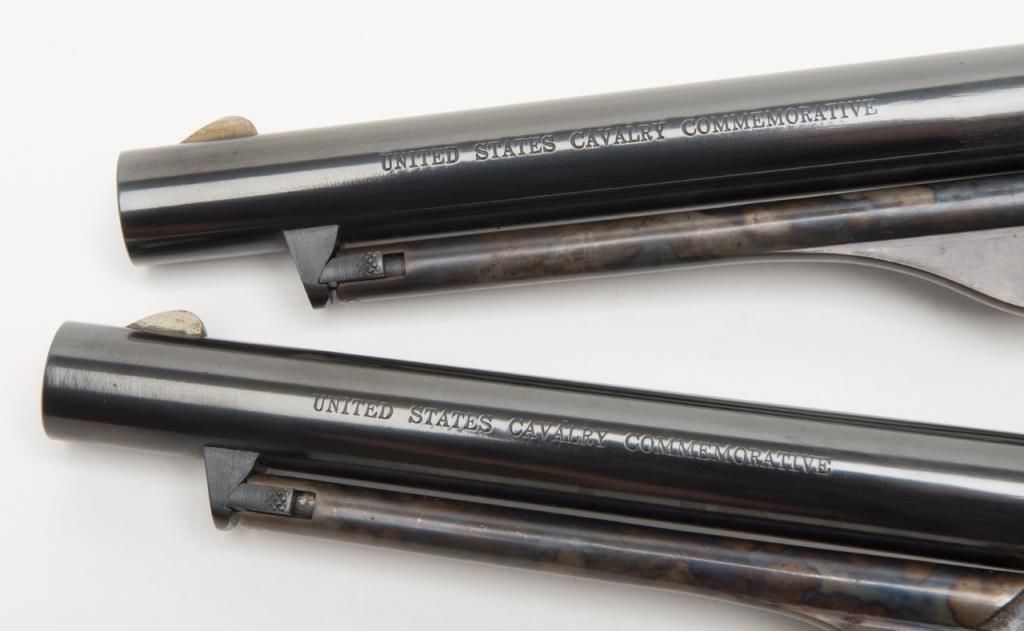Colt United States Cavalry 200th Anniversary Commemorative Presentation Cased Set (1777-1977) consisting of two Colt Blackpowder Series Model 1860 Army percussion revolvers, #s 2492US and US2492 plus a brass and woodshoulder stock, #US2492, all in like new condition showing little handling. The casing is also in fine condition with blue interior lining, blued bullet mold, powder flask, cap tin, lead balls, combination wrench/screwdriver and key to casing. Colt manufactured only 3,000 of these Commemorative sets for the 200th Anniversary. Est.: $1,500-$3,000.