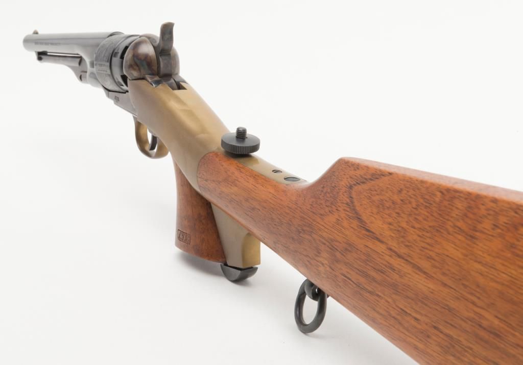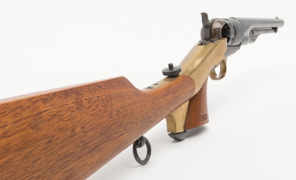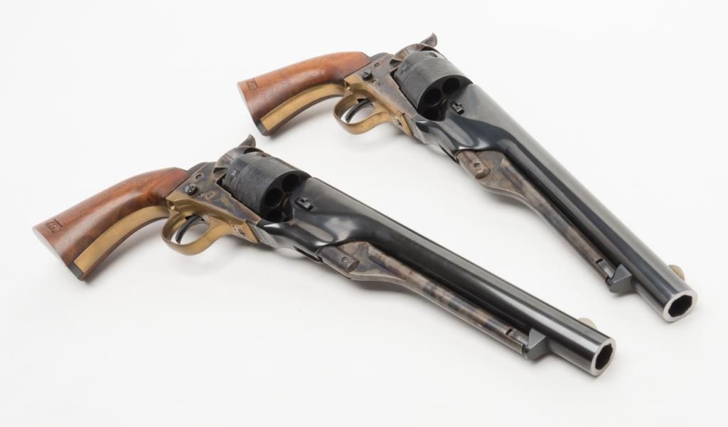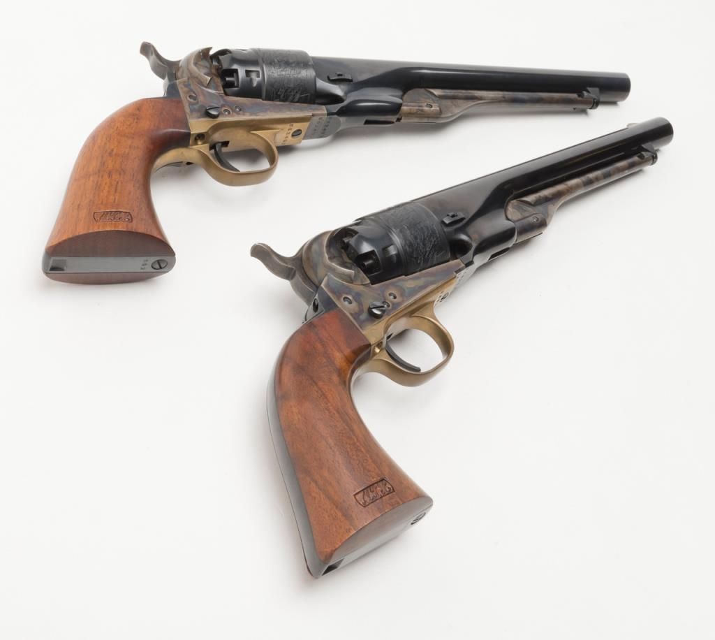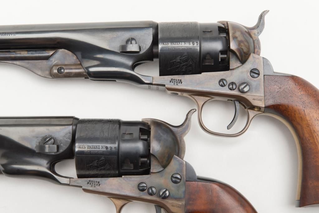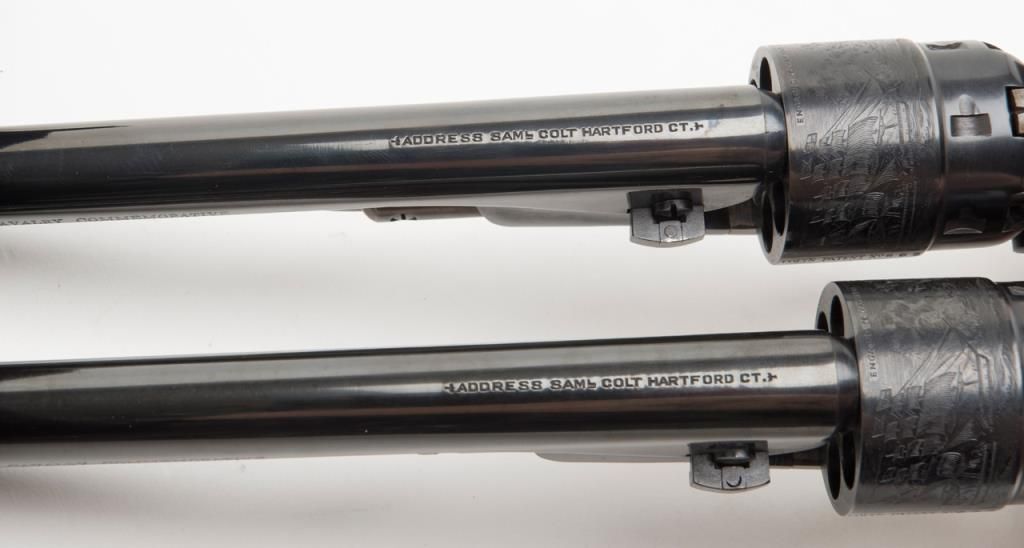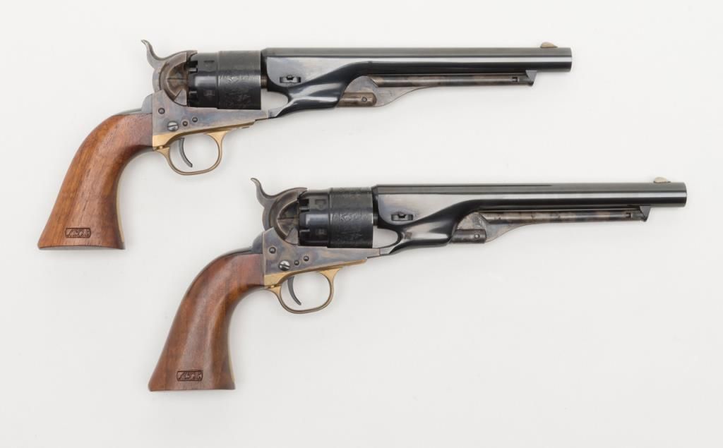 Colt United States Cavalry 200th Anniversary Commemorative Presentation Cased Set (1777-1977) consisting of two Colt Blackpowder Series Model 1860 Army percussion revolvers, #s 2492US and US2492 plus a brass and woodshoulder stock, #US2492, all in like new condition showing little handling. The casing is also in fine condition with blue interior lining, blued bullet mold, powder flask, cap tin, lead balls, combination wrench/screwdriver and key to casing. Colt manufactured only 3,000 of these Commemorative sets for the 200th Anniversary. Est.: $1,500-$3,000.