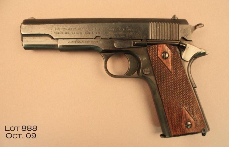 Colt United States Property Model 1911 semi-auto pistol, .45 cal., 5” barrel, military-style re-finish, checkered wood grips, #244388. This gun is in overall good condition showing approx. 80% of the old refinish remaining with scatterederosion and pitting under the finish, crisp action, good markings, worn but complete grips, fair + bore, later non-Colt manufactured magazine. Est.: $600-$1,200.