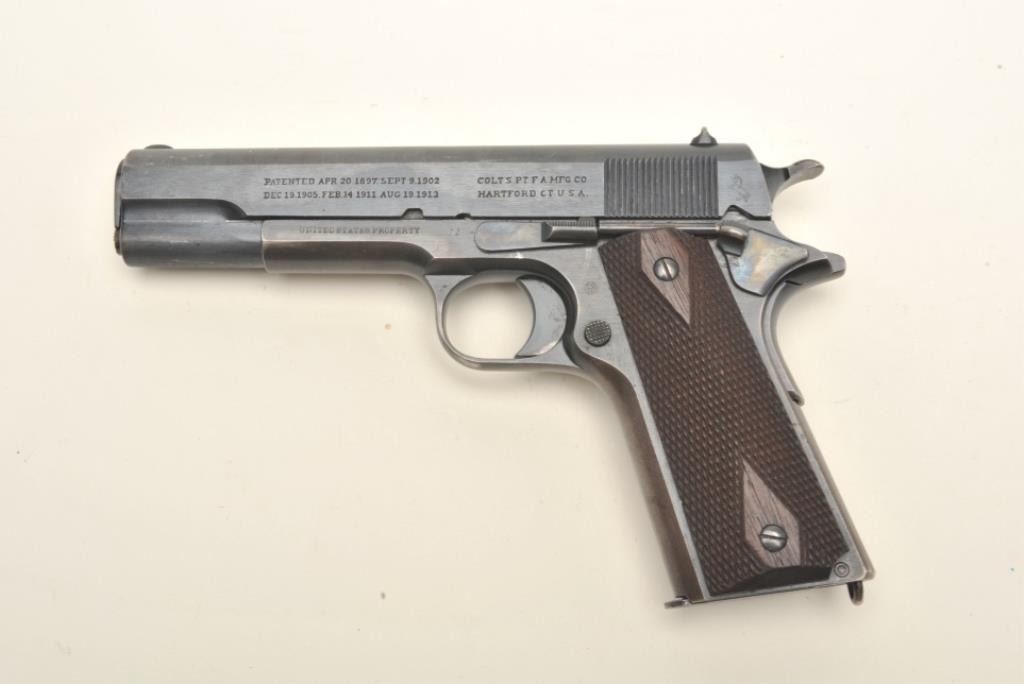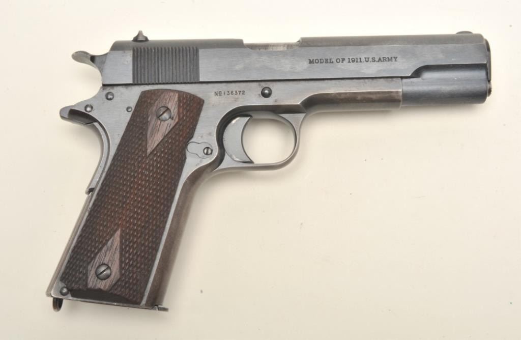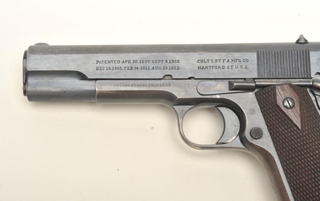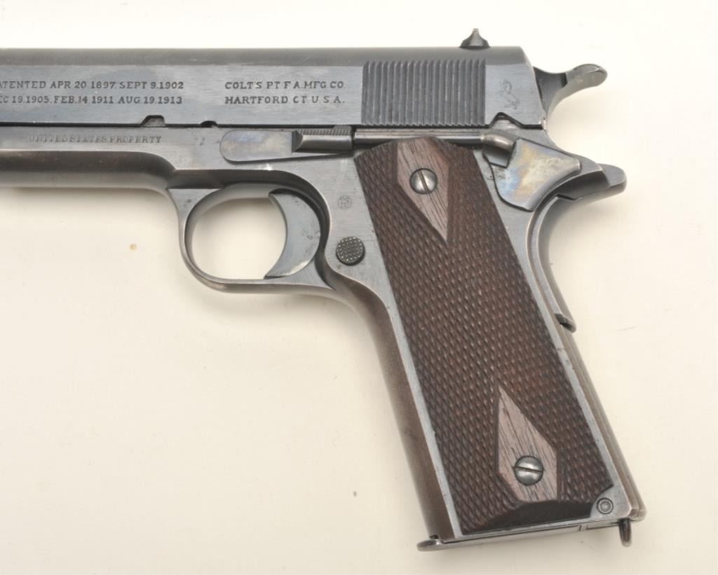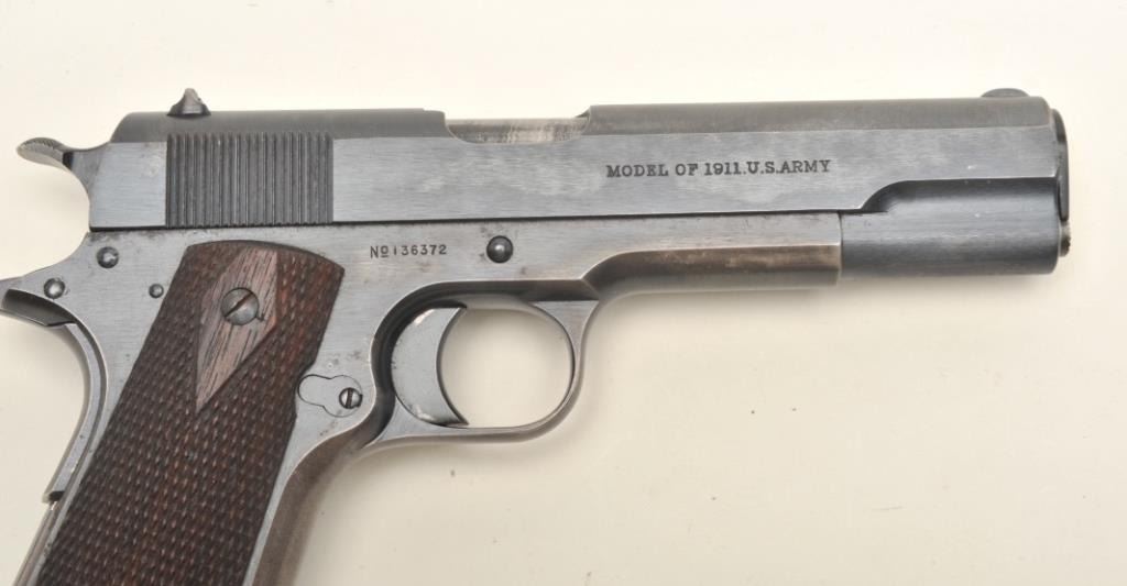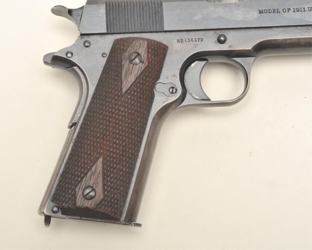 Colt United States Property Model 1911 semi-automatic pistol (ca. 1916), .45 caliber, 5” barrel, blued finish, checkered wood grips, two tone magazine, S/N 136372, in overall fine condition displayingapproximately 98% original blue, fine bore, crisp action and markings, fine grips. (C&R/PPT). Est.: $1,500-$3,000.