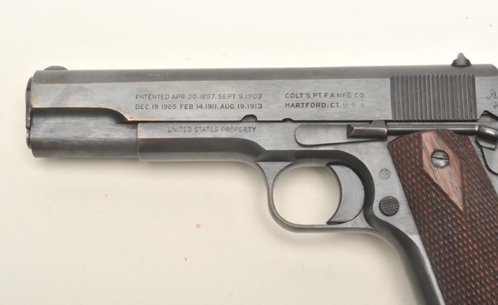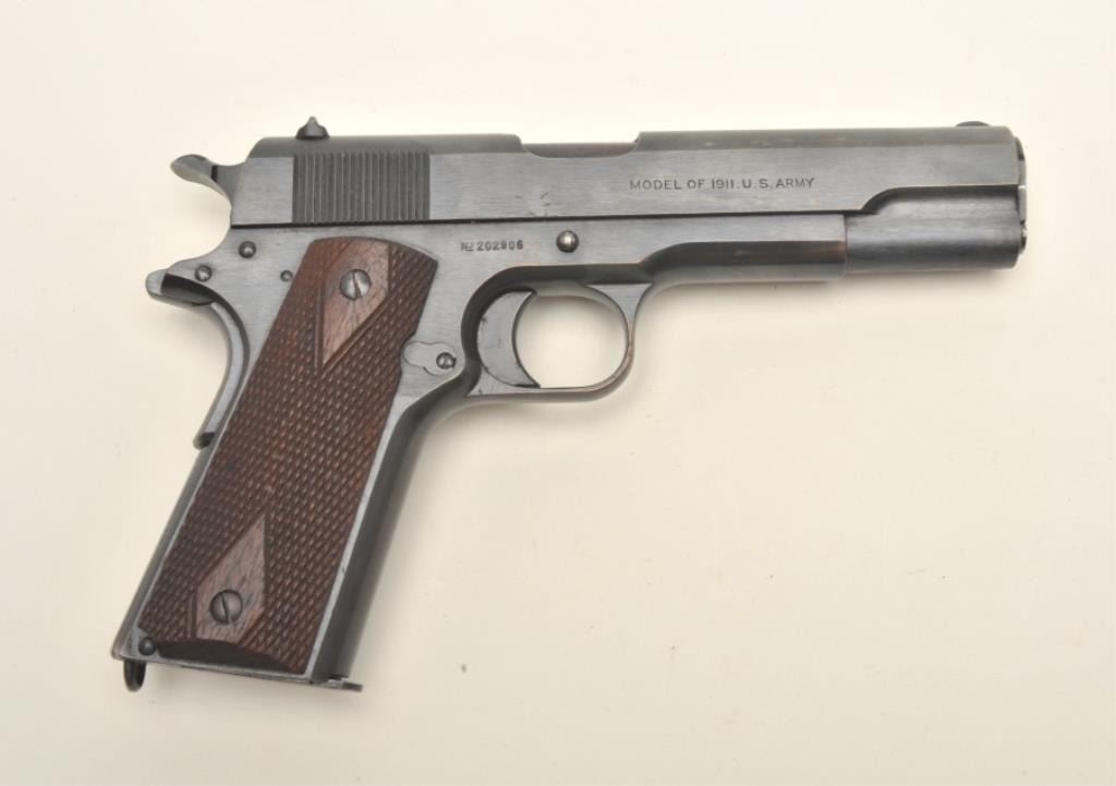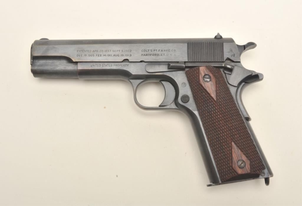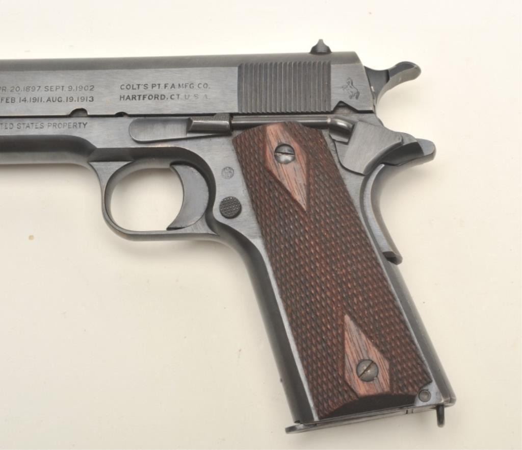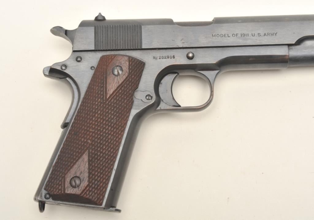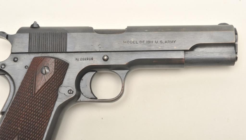 Colt United States Property Model 1911 semi-automatic pistol (ca. 1917), .45 caliber, 5” barrel, blued finish, checkered wood grips, two tone magazine, S/N 202906, in overall fine to excellent conditiondisplaying approximately 99% original finish, crisp action and markings, bore shows good lands and grooves with some scattered areas of erosion. (C&R/PPT). Est.: $2,500-$5,000.