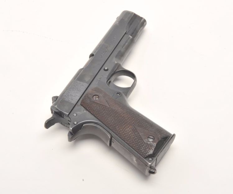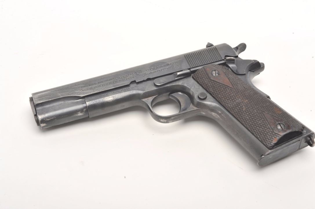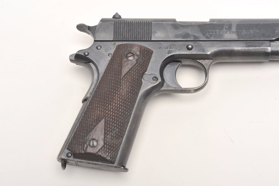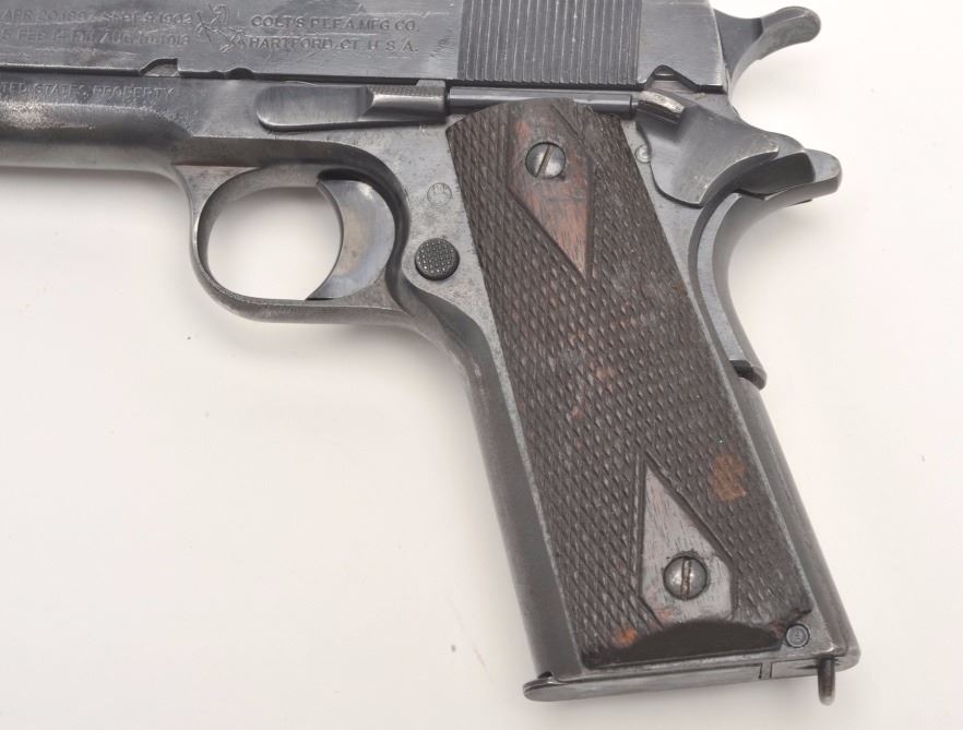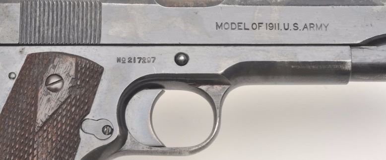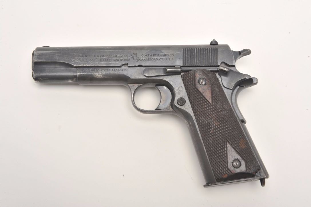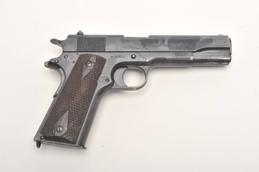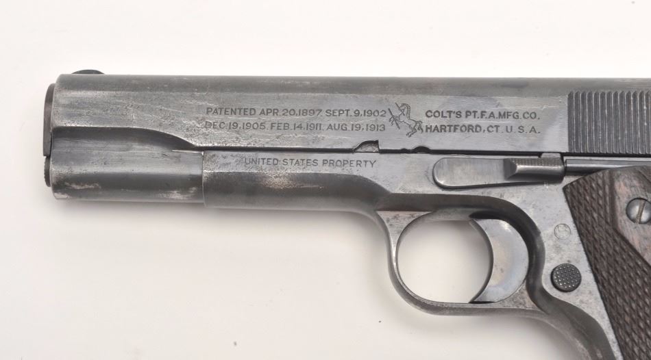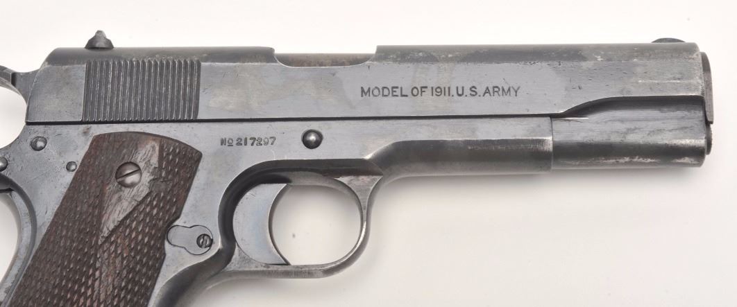 Colt United States Property Model 1911 semi-automatic pistol (ca. 1918), .45 caliber, 5” barrel, blued finish, checkered wood grips with two tone magazine, S/N 217297 (in U.S.M.C. shipped range for 1918(216987-217386 per Wilson’s Colt’s Dates of Manufacture)), in overall very good to near fine condition displaying the majority of its military blue finish with scattered pinprick pitting and some high point wear; fine bore, crisp action, sharp markings and good grips. (C&R/PPT). Est.: $2,000-$4,000.
