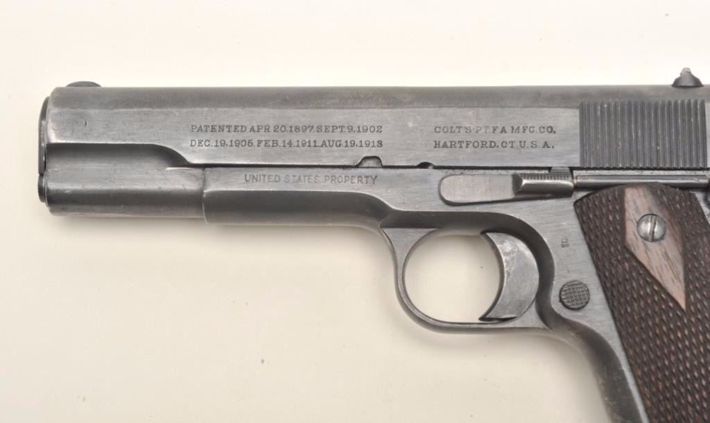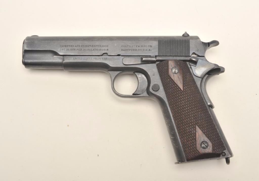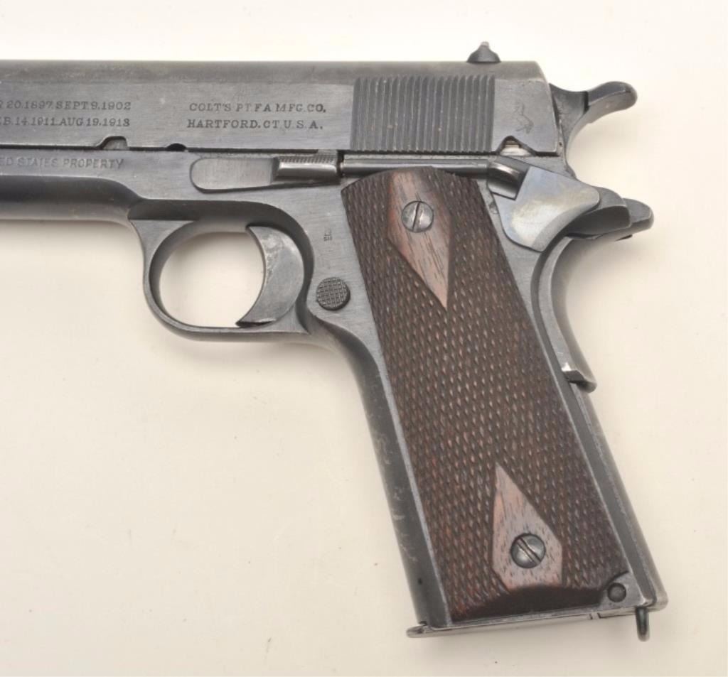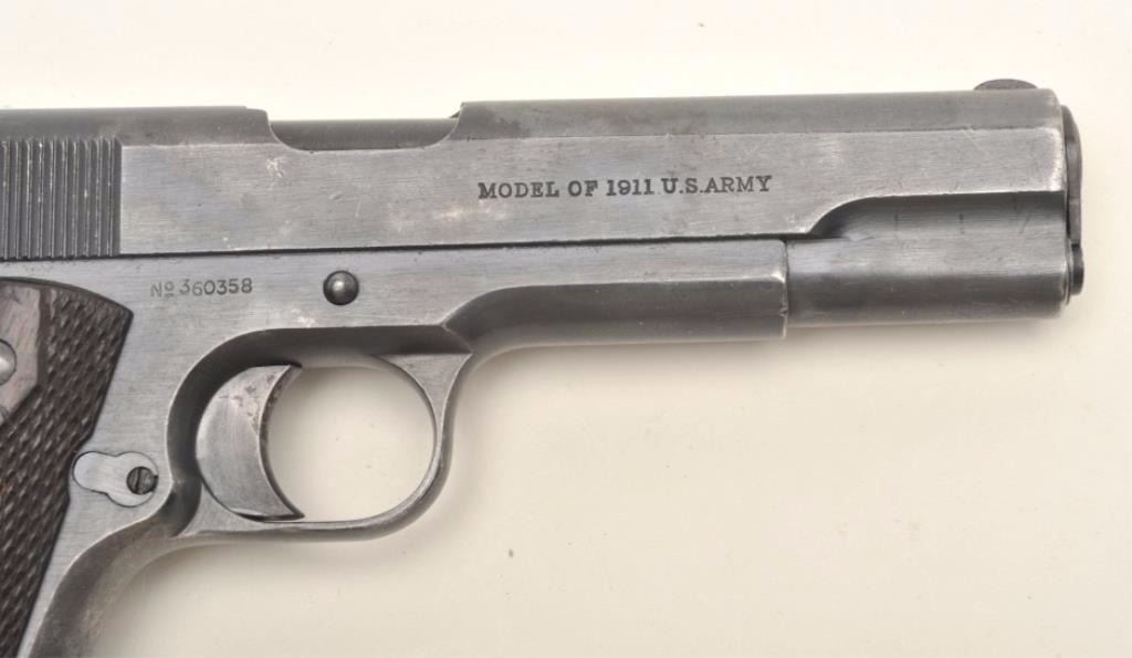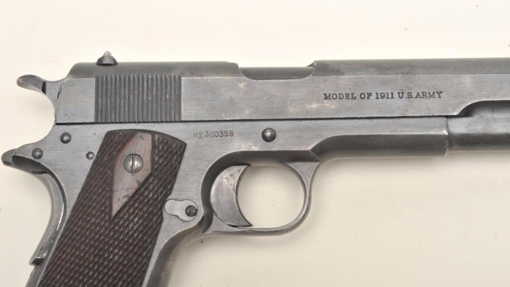Colt United States Property Model 1911 semi-automatic pistol (ca. 1918), .45 caliber, 5” barrel, “Black Army” finish, checkered wood grips, two tone magazine, S/N 360358, in overall very good to finecondition displaying the majority of its original finish, very good + bore, crisp action and markings, very good to fine grips. (C&R/PPT). Est.: $2,000-$4,000.