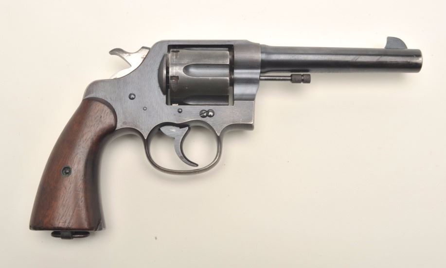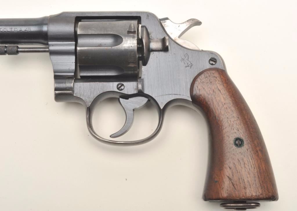 Colt United States Property marked U.S. Army Model 1917 DA revolver, .45 caliber, 5.5” barrel, military finish, smooth wood grips, S/N 146020, in overall fine condition with majority of its military finish remaining;crisp action, sharp markings, fine bore, very good + wood grips with a small old chip to the front right grip bottom; accompanied by a leather military flap holster with maker’s mark on reverse “G. Edgley, Maker,Townsville” (C&R/PPT). Est.: $500-$1,000.