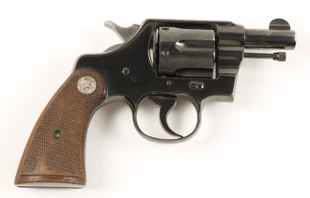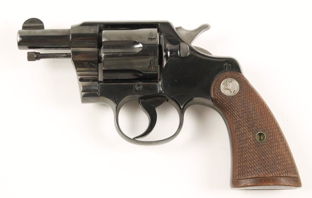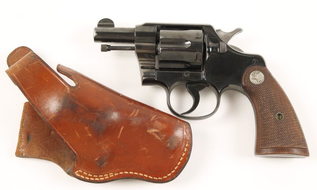 Re-blued (and probably re-barreled) double-action 6-shot revolver with a 2-3/8" barrel. Finish is good with edge wear on the muzzle, cylinder, frame and trigger guard. Some few scratches on the crane and spots of surface rust on the bottom of the butt. The barrel does not have a shoulder boss abutting the frame and there is no roll-stamping on the barrel. The bore and chambers are shiny with sharp rifling present. The checkered wood grips (with medallions) are worn smooth in 2 spots and they have a few dings and a gouge on the bottom of one. Function is smooth with tight lock-up. Includes a leather high ride holster in good used condition. Condition is good. *Modern Firearm*