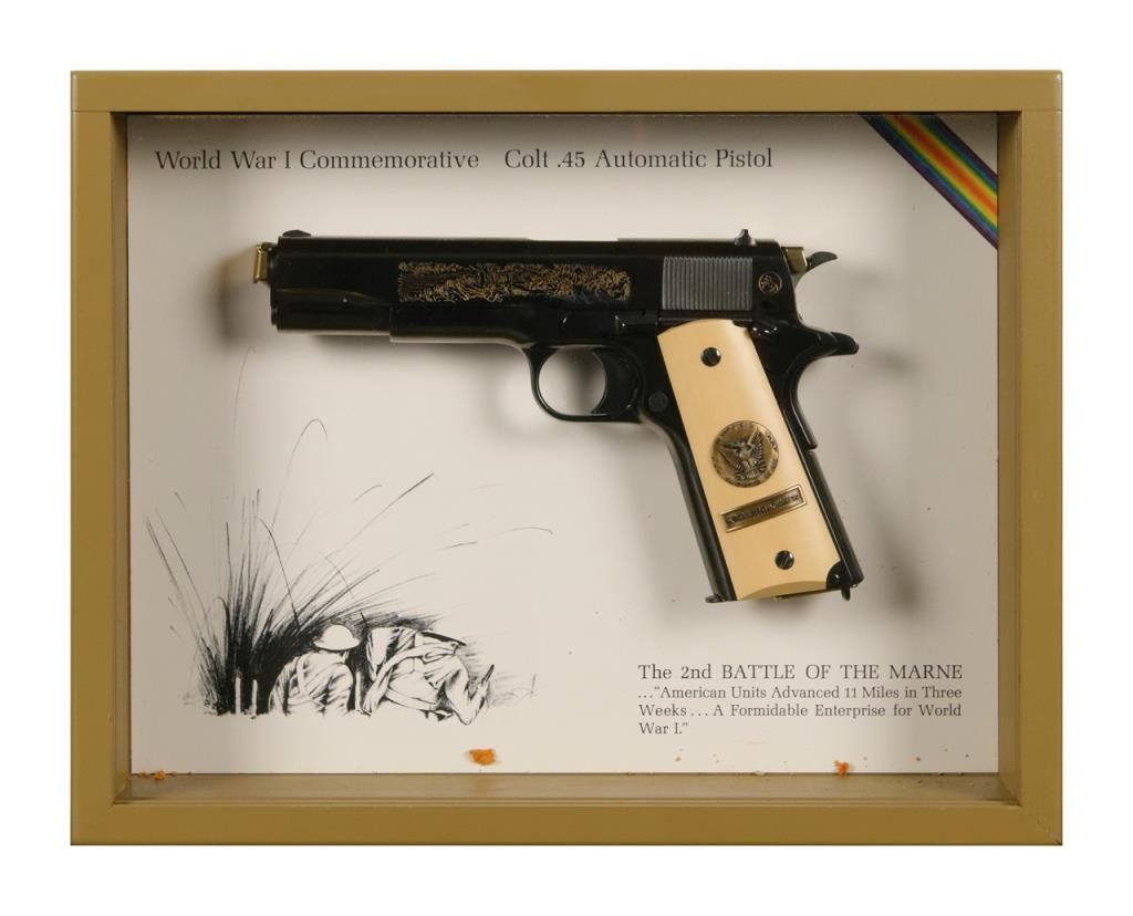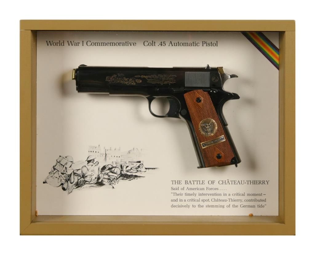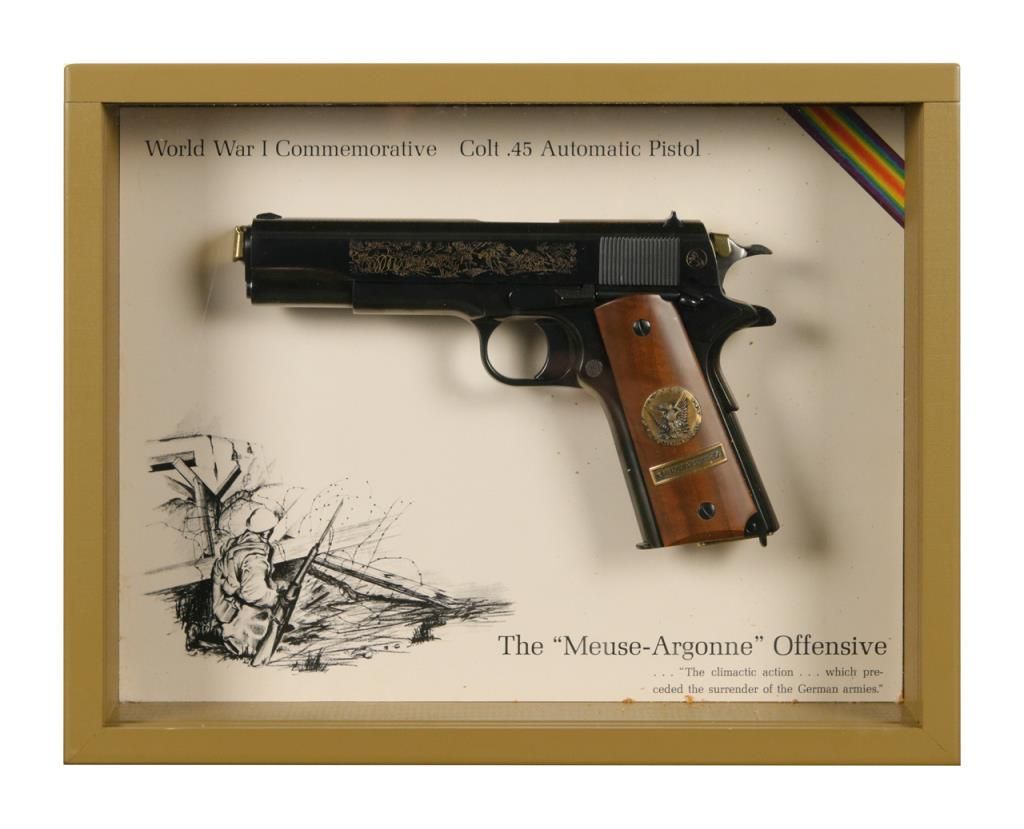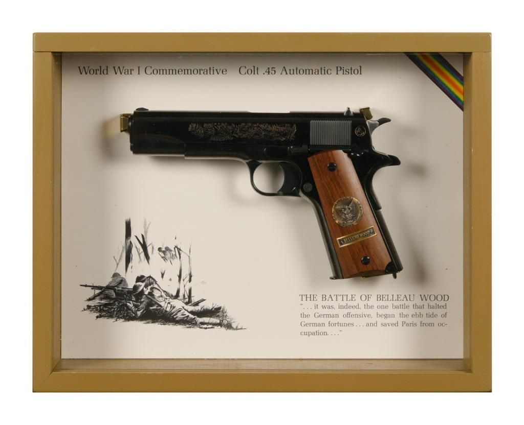 Colt WWI commemorative four gun set in .45 ACP caliber with decorative factory motifs. In their original display cases. In fine to excellent condition with 98% to 99% plus. No evidence of firing or use with slight storage and handling only. Serial number 1384. Est.: $2500-$5000 for the set