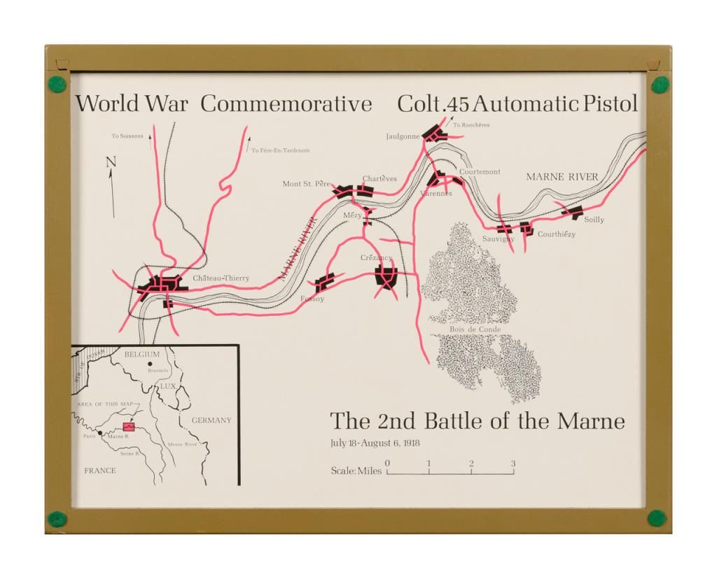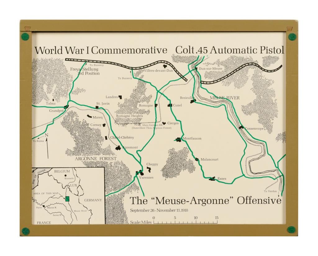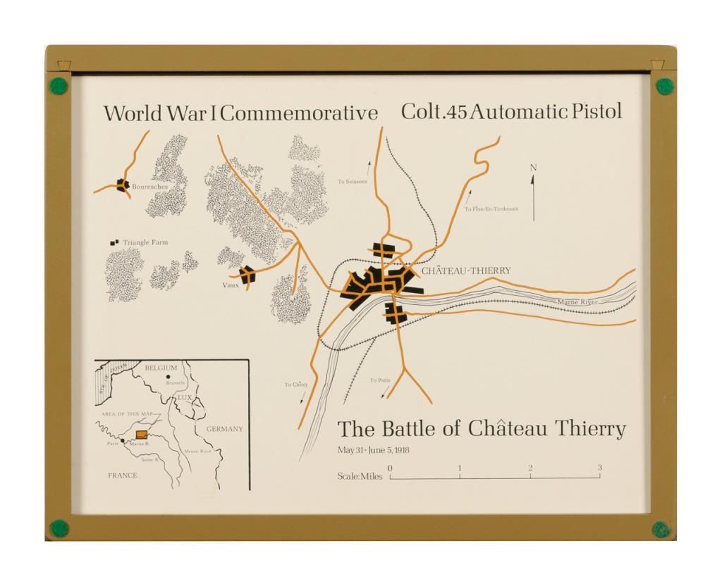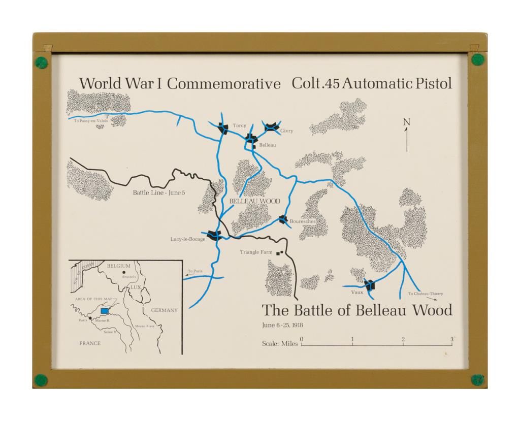 Colt WWI commemorative four gun set in .45 ACP caliber with decorative factory motifs. In their original display cases. In fine to excellent condition with 98% to 99% plus. No evidence of firing or use with slight storage and handling only. Serial number 1384. Est.: $2500-$5000 for the set