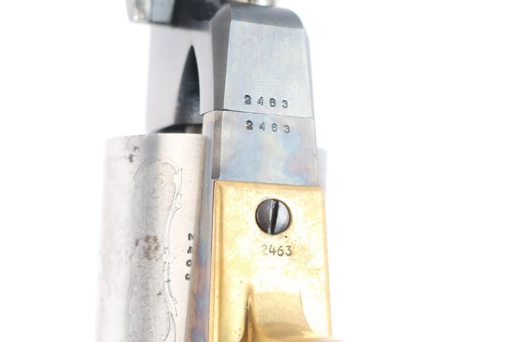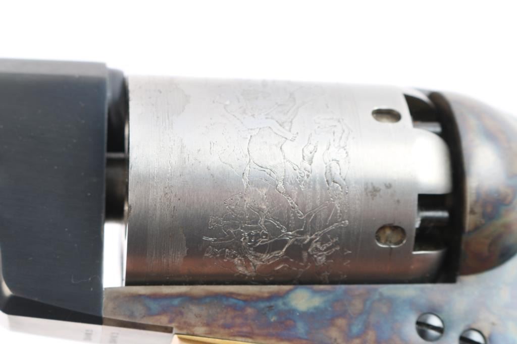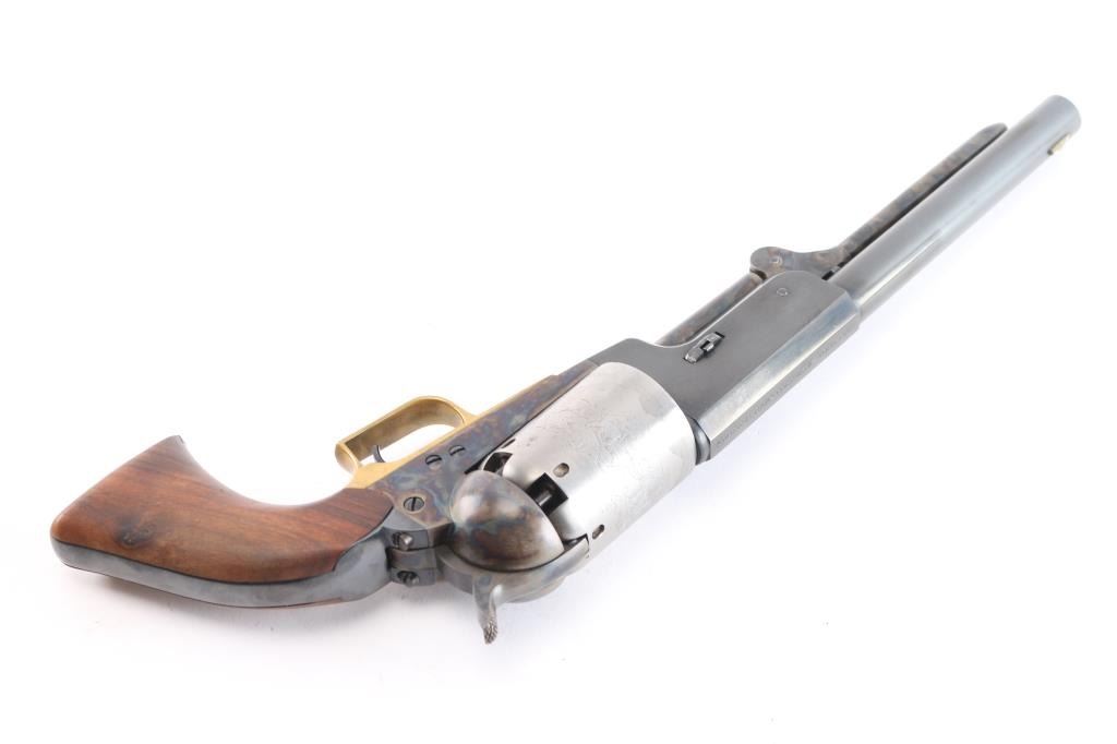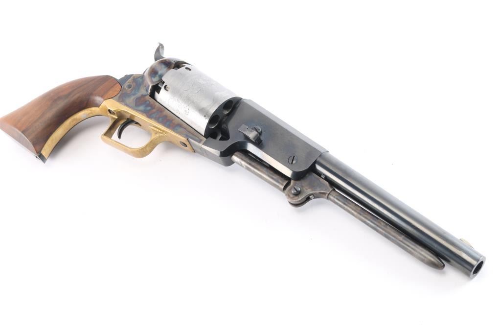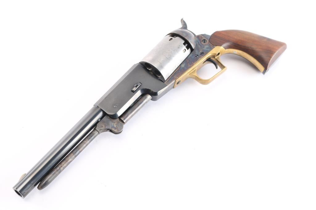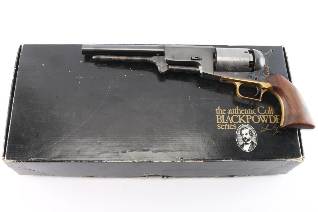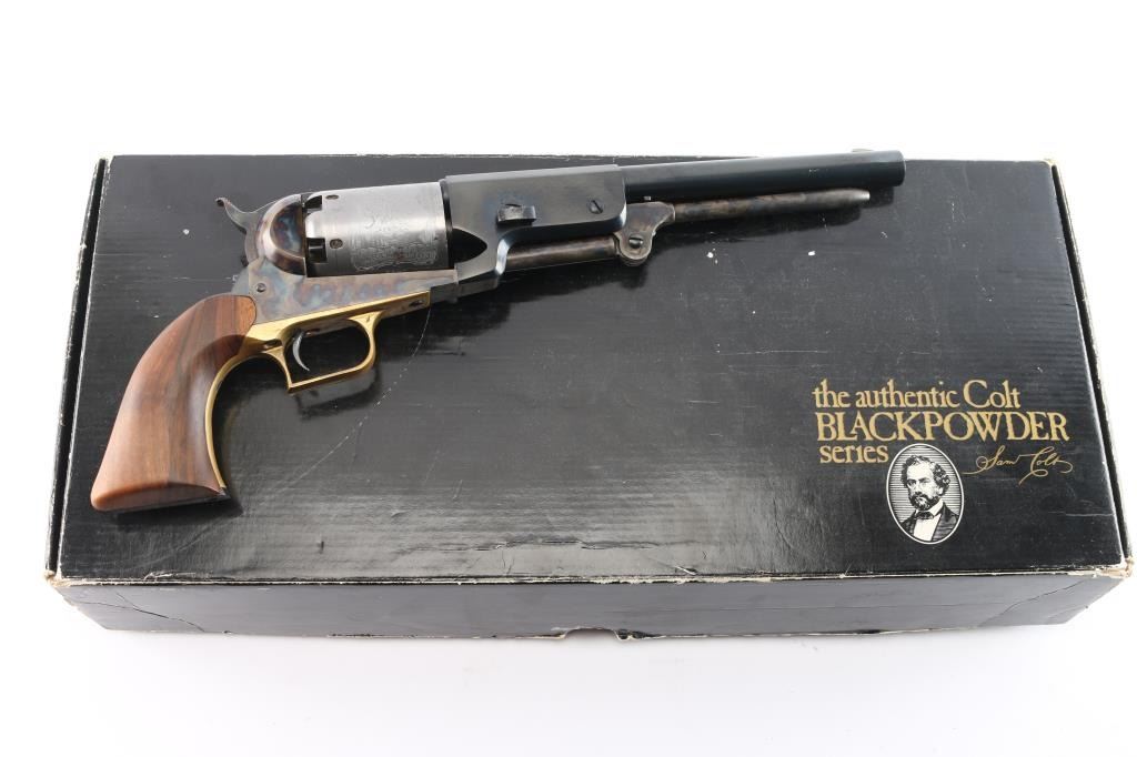 'Black Powder Series' Finely crafted reproduction of the Colt Walker. Features a blued/case hardened finish, 9" barrel, blade front sight, 'v' notched rear sight on the hammer, rare "in the white cylinder" unfluted six-shot cylinder with roll stamped battle scene on cylinder & oval stops, loading lever, brass square back triggerguard, smooth blackened back strap and one-piece smooth walnut grip. Right barrel stamped "U.S. 1847" Includes the black factory cardboard box with instructions, fitted insert and matching label. Condition is nearly like new with few signs of handling.
