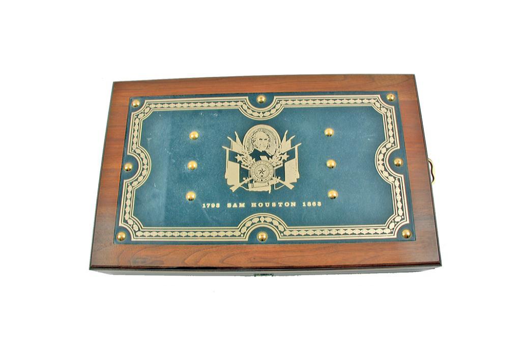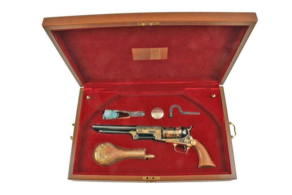 Colt Walker Commemorative Cal .44 SN:1220 Presentation wood cased with accessories, Italian made copy of a Colt Walker Model percussion revolver authorized by the United States Historical Society entitled "The Sam Houston Pistol" commemorating the TePresentation wood cased with accessories, Italian made copy of a Colt Walker Model percussion revolver authorized by the United States Historical Society entitled "The Sam Houston Pistol" commemorating the Texas Sesquicentennial,9" barrel, blue finish with gold ornamentation on the frame, cylinder and barrel assembly, brass trigger guard and back strap, wood grips with inset of Sam Houston on the top of the left grip. This gun is in like new condition and is nicelyornamented with images of the Alamo, Texas and Confederate flags, Indian tomahawk, map of Texas, etc. The box is maroon lined with reproduction brass powder flask, bullet mould cap tin and combination wrench; the outside of the wood box is decorated with an inset panel showing Sam Houston's likeness, flags and stand of Texas flags. The case itself is in overall excellent condition.