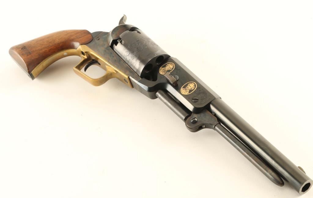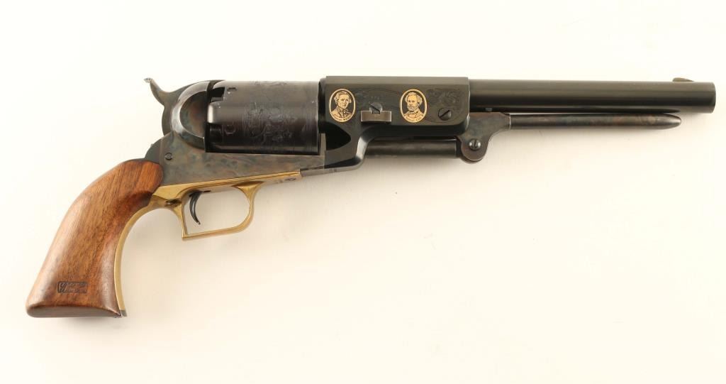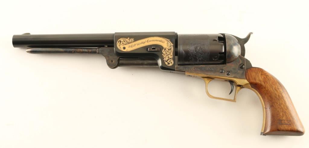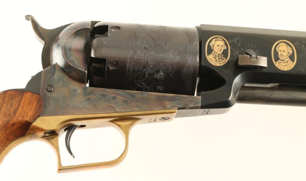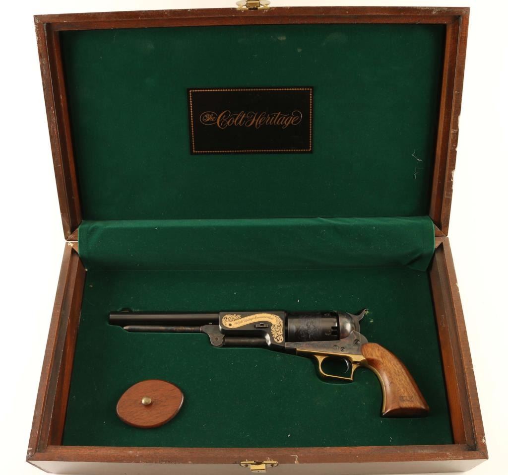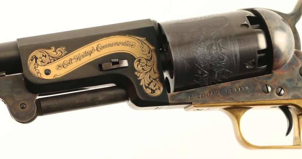 C Company No 1170 ‘The Colt Heritage Commemorative’ Embellished reproduction of the Colt 1847 Walker single action percussion revolver in .44 caliber, manufactured circa 1980. Features a blued & case hardened finish with gold gilt embellishments, 9" part octagonal barrel, blade front sight, ‘v’ notch rear sight cut into the hammer lip, loading lever, unfluted six-shot cylinder with roll stamped Indian battle scene, smooth trigger, brass square back trigger guard, knurled hammer spur, and one-piece walnut grip with boxed inspector cartouches. The left side of the barrel features a banner with “The Colt Heritage Commemorative” & floral scroll and the right side is adorned with portrait bust of Samuel Colt and Samuel Walker. Includes a factory walnut presentation case with green velvet lined French fitted interior. Revolver exhibits approximately 99% of its original finish with light edge wear and some slide wear on the loading lever. Action is smooth, the bore is excellent and the wood grip is fine. Condition is NRA Excellent in case. ***Antique Firearm***