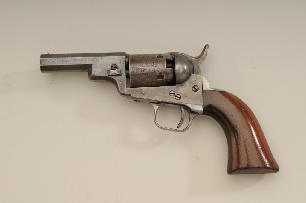 Colt Wells Fargo Model percussion revolver, 3” octagon barrel, blue and case hardened finish, wood grips, #57773. This gun is in overall fine condition showing considerable muted original blue finish on the barrelassembly, considerable muted original case colors on the frame and hammer, all matching visible serial numbers including the wedge and cylinder arbor, approx. 98% crisp original stagecoach holdup scene on cylinder, crisp action, good bore with a couple spots of pitting; silver finish remaining on backstrap and trigger guard is approx. 99% complete; grips are fine overall with several scattered old mars and majority of originalfinish. A really nice Wells Fargo Model that even shows portions of all its stop pins on the back of the cylinder! Est.: $7,500-$15,000.
