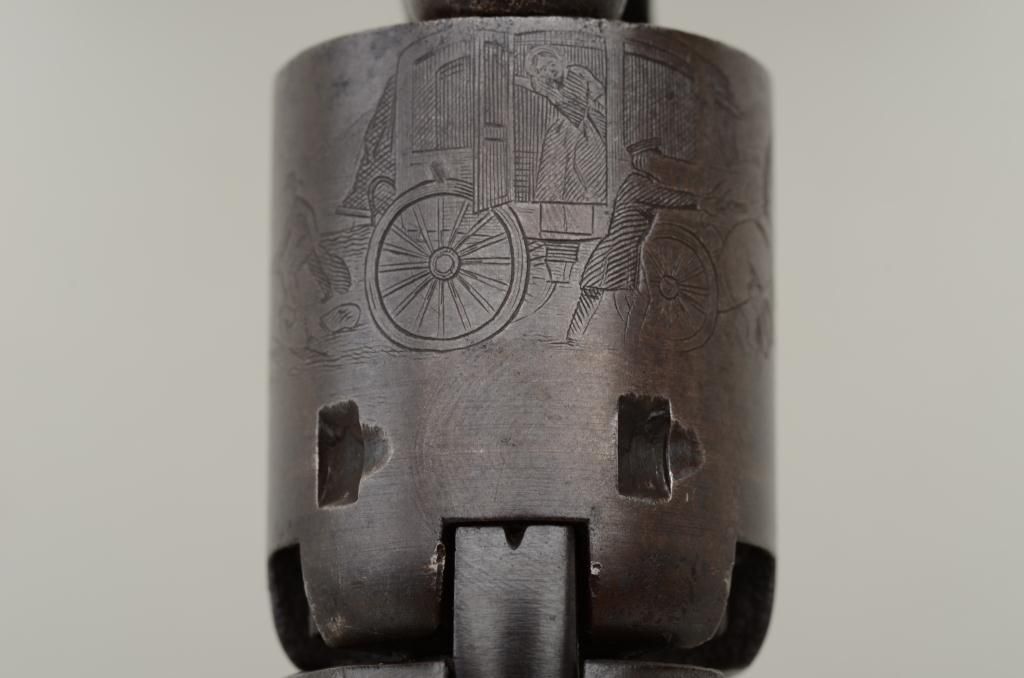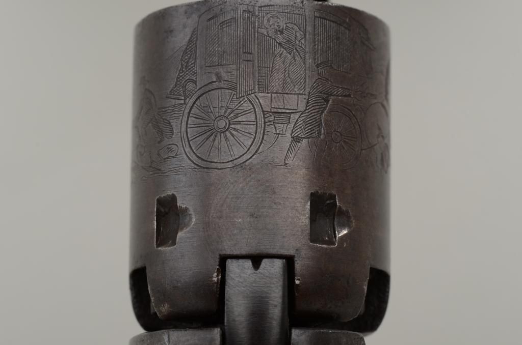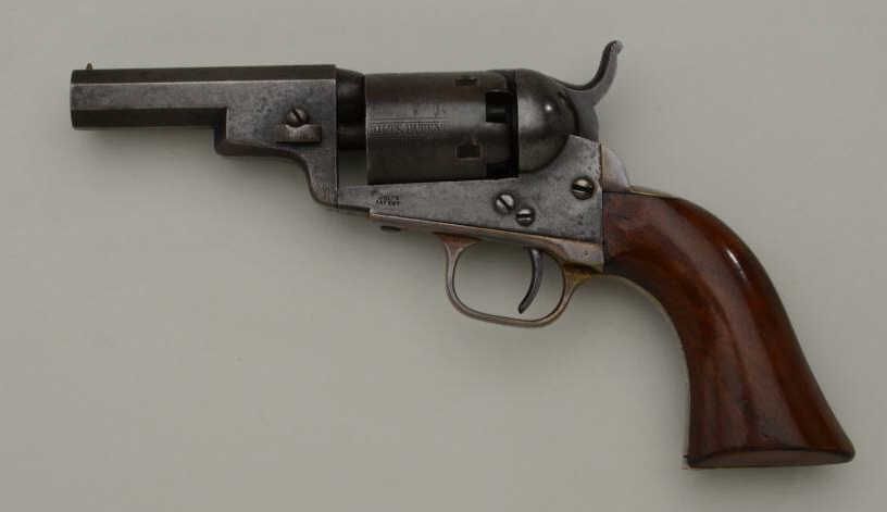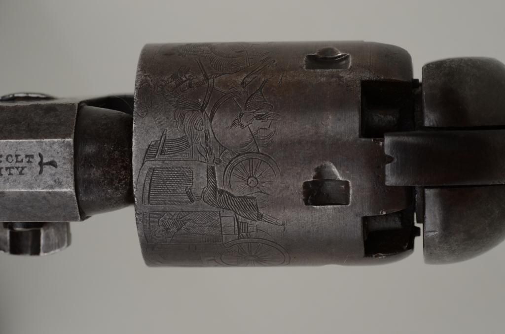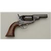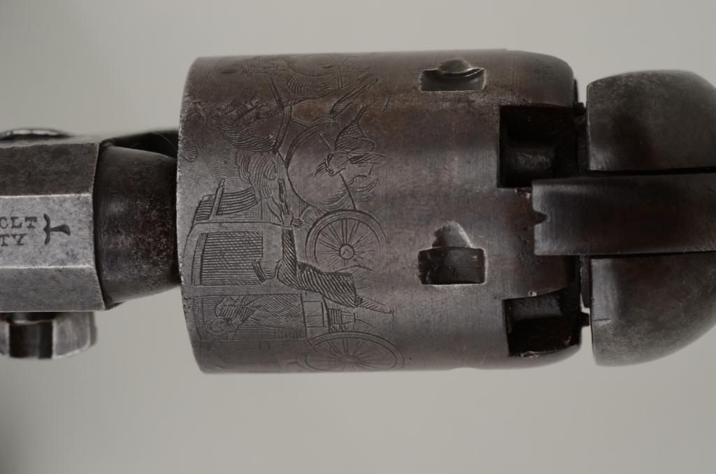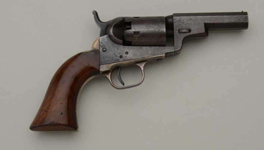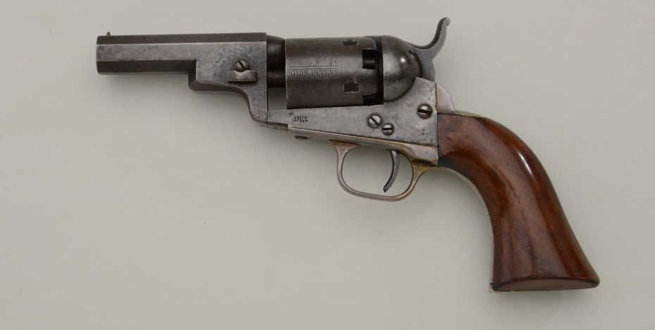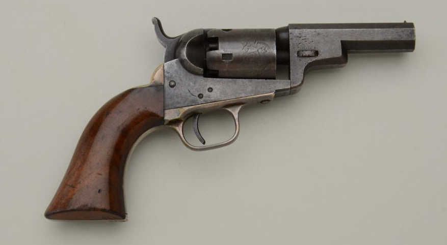Colt Wells Fargo variation of 1849 pocket model in .31 caliber percussion with factory 3” barrel and no provision for ramrod. Serial number 104254. The revolver remains in very good original condition with approximately20% to 40% original blue and case hardening mixing with a patina finish. There is some minor erosion and pinprick pitting just starting. There are some nicks and mars on the right side of the barrel lug from removal of wedge. The cylinder shows 80% to 90% crisp original stagecoach scene. All matching visible serial numbers including wedge. The grips show 80% to 90% original varnish and are very good plus to near fine with veryminor imperfections. The trigger guard and backstrap show 75% to 85% original silver that is darkening and uncleaned. The markings are sharp and edges are crisp, the bore is very good. A far better than average andoriginal Wells Fargo variation. Est.: $3,500-$7,000.