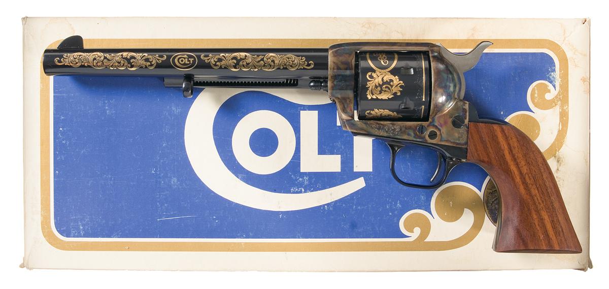 This Colt/Winchester commemorative revolver features gold floral patterns. The cylinder has floral patterns, "WC" and a Rampant Colt also in gold. The backstrap has the signature "COL SAM COLT" in gold. Standard markings and features and fitted with a smooth one piece walnut grip. Complete in original box numbered to the gun.