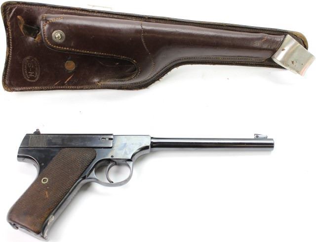 semi auto pistol with 6 1/2" barrel, blued finish and checkered walnut grips, nice original blued finish, excellent action and very good bore. Includes N Bar S holster shoulder stock. Modern. Est. 800-1000