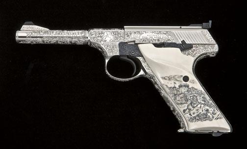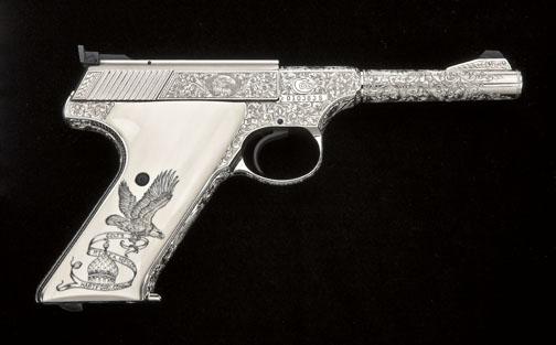 Colt Woodsman .22 caliber semi-automatic pistol, 4-1/2” barrel, factory engraved by Howard Dove in with Helfricht influence, nickel and blued finish, smooth ivory grips scrimshawed on right with eagle and Colt dome motif, and on right side with medieval jousting scene. The depiction of eagle with spread wings on slide. Shipped to Navy Arms Co, March 24, 1994, custom shop order 1494, one gun in shipment, serial #101383S. Refer:The Colt Engraving Book Vol. II, page 851 where this Colt is featured in full color with three views. Factory information is verified in the text. The pistol remains in fine to excellent condition, 99% mint, noevidence of firing or use, just possible test-firing. The grips are excellent, the small fire-blued parts retain all their finish. One of the most attractive factory engraved Woodsmans we have ever viewed andthe only example we have seen offered for sale engraved by Howard Dove, who is considered one of the all-time masters. The Howard Dove award is presented each year at the Colt Collector’s Association gun show for