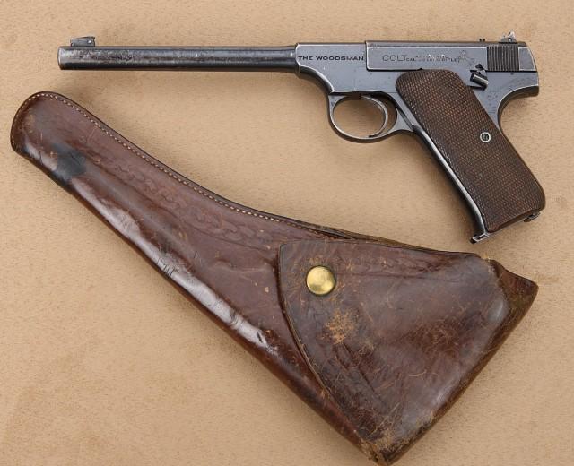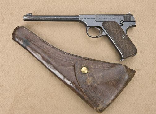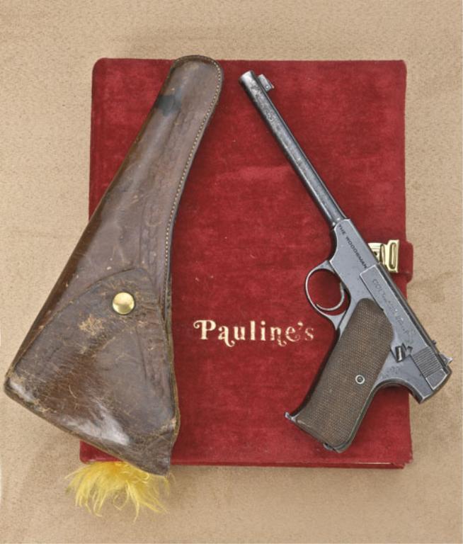 Colt Woodsman .22 caliber semi-automatic  pistol, blued finish, checkered wood grips,   serial #85097, with holster and affidavit  attesting to ownership by “Big Gene”, who  worked with Al Capone, and whose given namewas Eugene Westergon. The pistol remains in  good original condition with approx. 40-60%  original blue, some pitting and erosion from  contact with its holster, good markings, good  grips, good action, good bore, correctWoodsman marked magazine. An affidavit is  dated August 17th, 1994, signed by James R.  Ireland, notarized Alberta, Canada, who  states the aforementioned pistol was  purchased from Big Gene’s estate. Big Genewas a member of the Capone mob in Chicago and  lived at the Lexington Hotel. He assisted  with running booze across the border and all  manners of nefarious activity. The town  became too hot for Gene and he left after ashooting incident during a rum-running caper.  He emigrated West and North in the 1940’s  and was well known throughout Canada. He was  known to have a vicious temper and use brute  force. However, towards the end of his life,