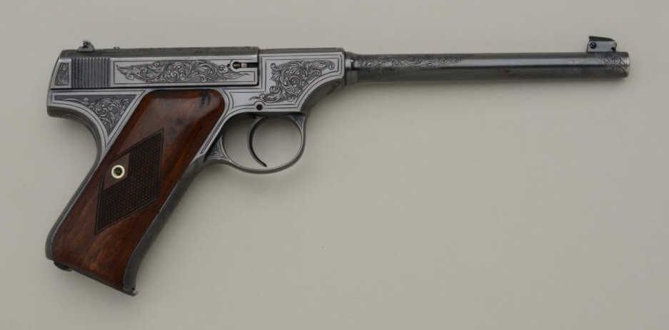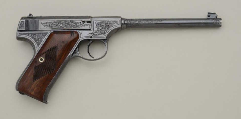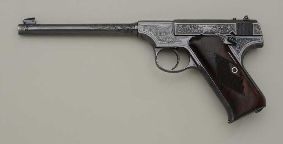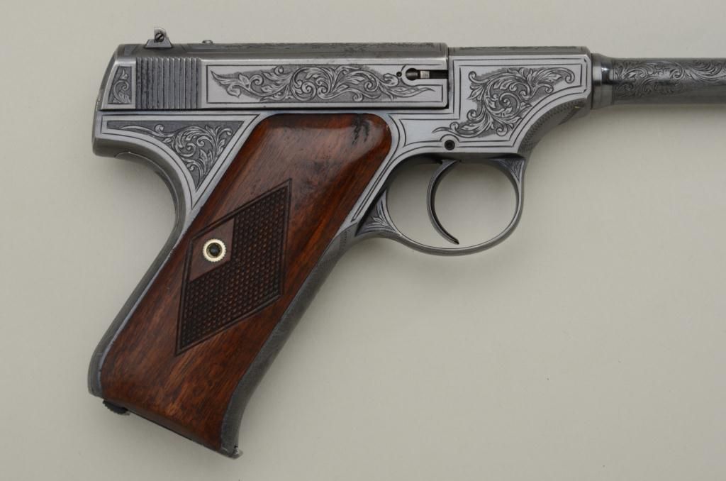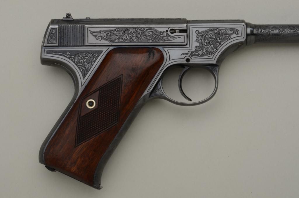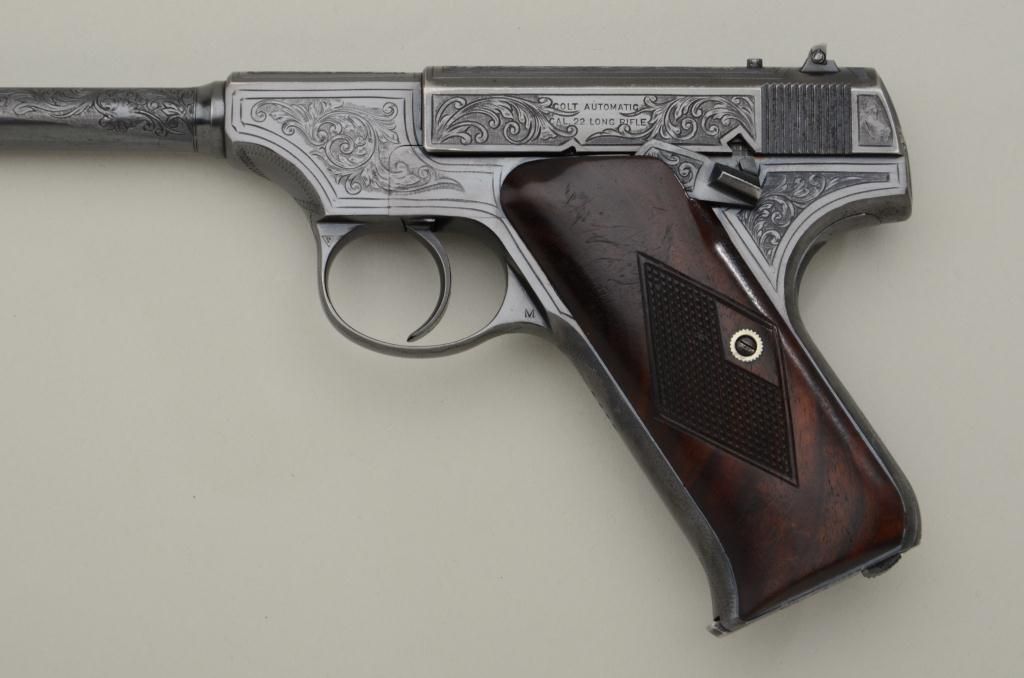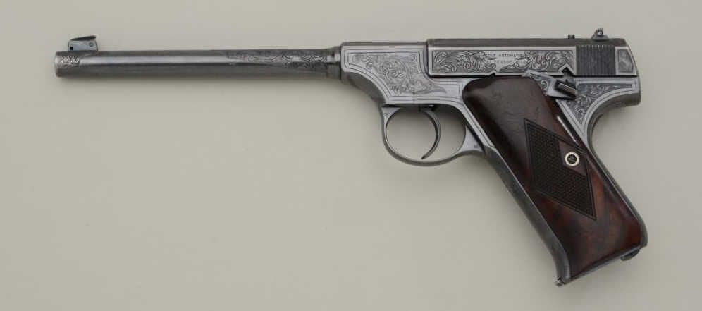 Colt Woodsman .22 caliber semi-automatic pistol factory engraved, serial number 5625. Factory letter confirms features and shipped green or soft to W. H. Gough, Utica, New York March 19, 1917, 3 guns in shipment. Underremarks the factory letter states “The word green indicates the subject pistol was shipped without final finishing for engraving outside factory”. As noted this pistols sent to W.H. Gough who was an engraver for Coltduring this period. The records further indicate subject firearm was returned to the factory and reshipped to H & D Folsom Arms Company, New York, New York, April 28, 1917. The Woodsman shows select factory checkeredsmoothed sided wood grips in a unusual factory checkering pattern. Shows fine scroll engraving in Gough style and showing bull’s-eye engraved on rear of frame. The pistol remains in very good plus to near fine condition with 75% to 85% plus original blue just thinning on the edges of the barrel and muzzle. The markings are sharp and the edges are crisp. The grips are very good with some minor marks and handling. The interior shows