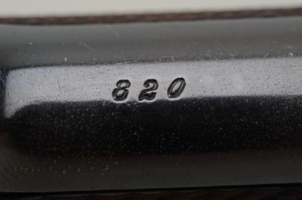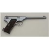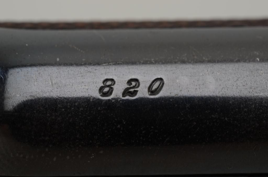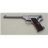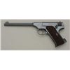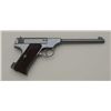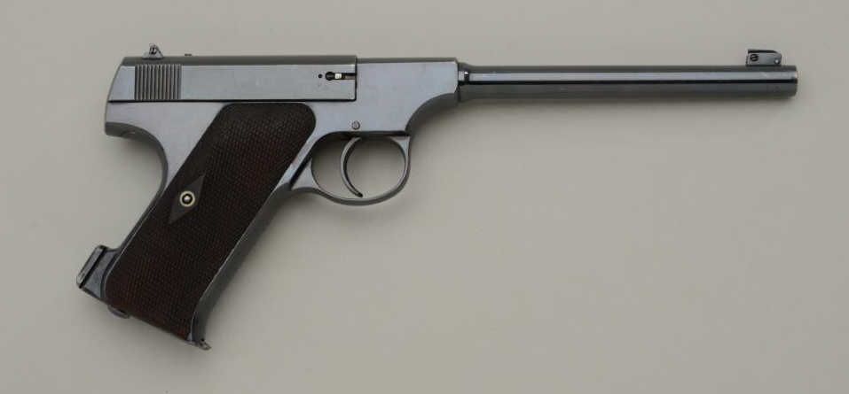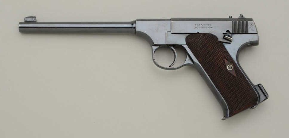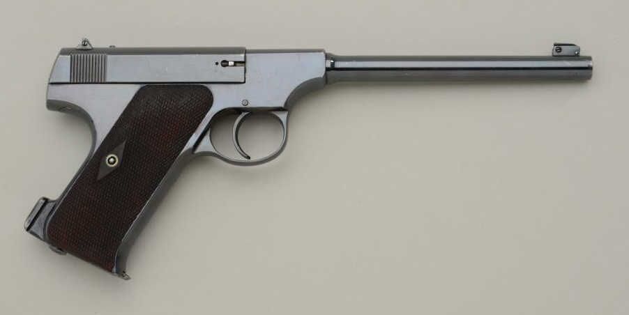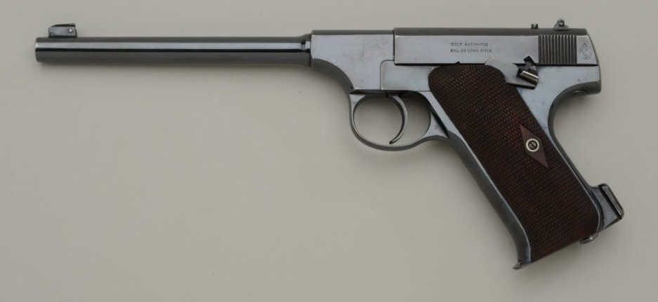 Colt Woodsman .22 caliber semi-automatic pistol with factory 6 ½” barrel showing odd stud at rear of frame for attachment of shoulder stock. Serial number 820. Made in 1915 during 1st year of production. Thepistol retains 90% to 95% original high polish early blue finish with some minor scratches, slight losses at the edges. The blue finish is very inky and still bright. The Colt shows early barrel address andrampant Colt marking on rear of slide. There is a Y proof at the rear of the trigger guard and the quality of the stock lug and matching blue finish lead us to believe it to be a factory experimental feature. The grips are in very good plus to near fine condition with just some slight edge wear. The action is tight and the bore is bright showing just normal use. A two-tone Colt marked clip is retained. From the collection of Joe Kiserformer president of Colt Collectors Association and one of the Western United States most renowned old-time collectors. Est.: $1500-$3000