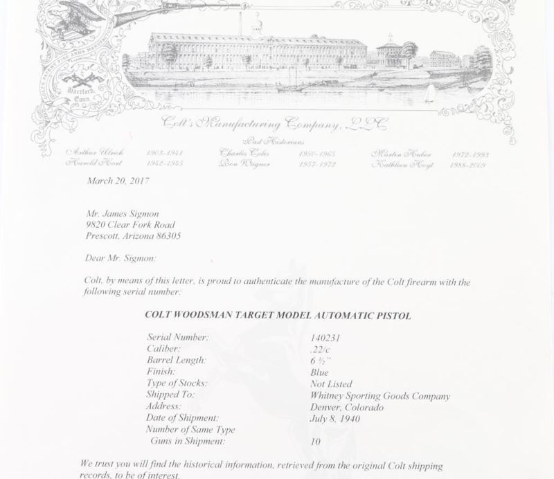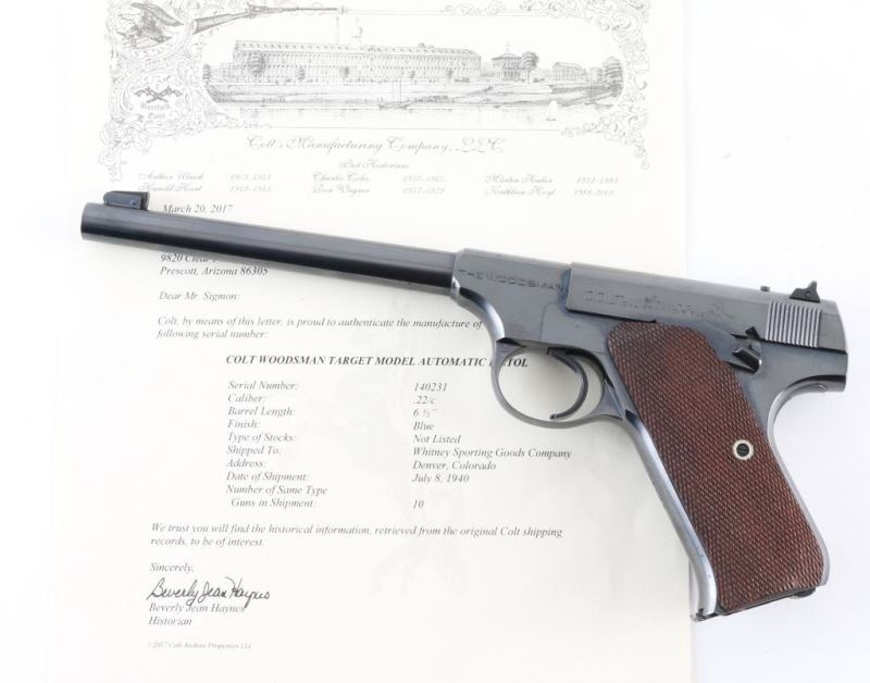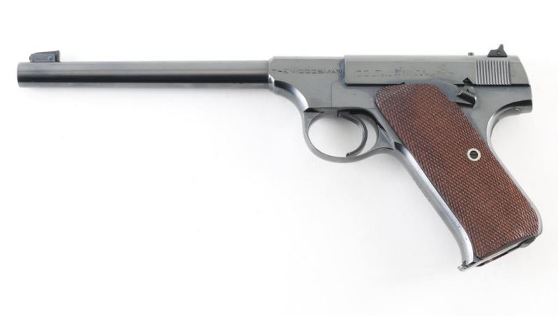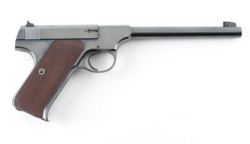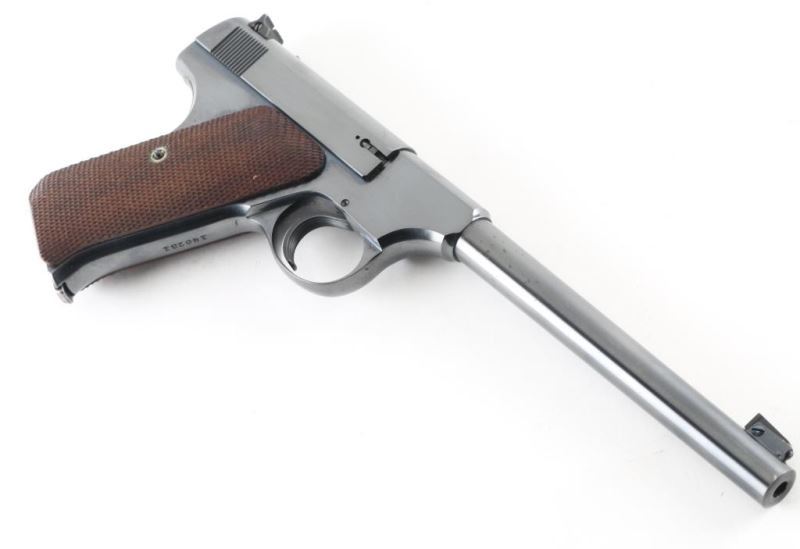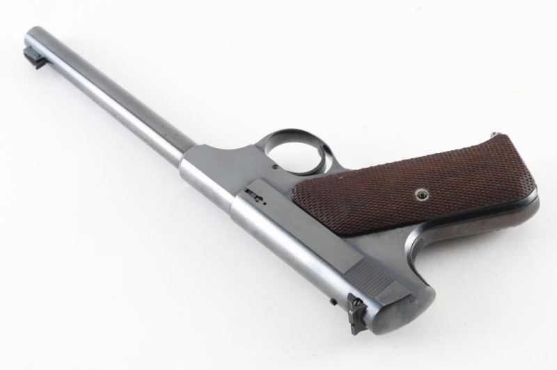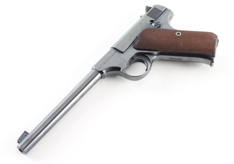 Semiautomatic rimfire pistol manufactured circa 1940. Features blued finish, checkered walnut grips, 6.5" barrel, blade front sight, rear sight in dovetail with screw adjustments, heel magazine release, manual safety. Bore is very good condition. Retains 90% blue, with edge losses, some thinning or discoloration on backstrap. Grips are very good condition; grip screw is a replacement that is too long, needs trimmed. Includes Colt factory letter, (1) magazine. Condition is NRA Very Good++ *** C&R Firearm *** [From the Jim Sigmon Collection]