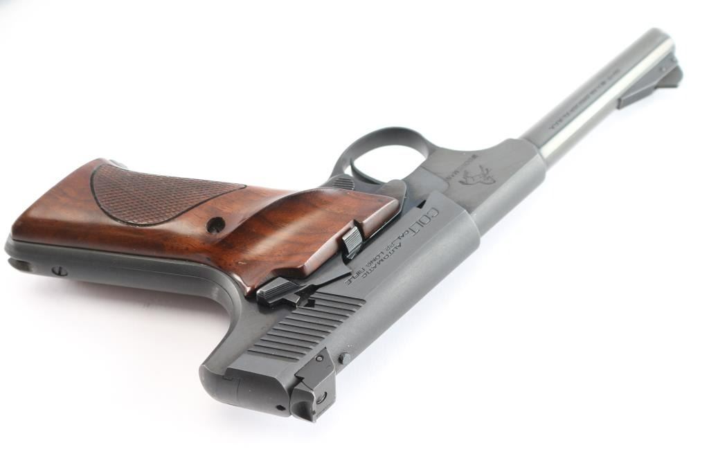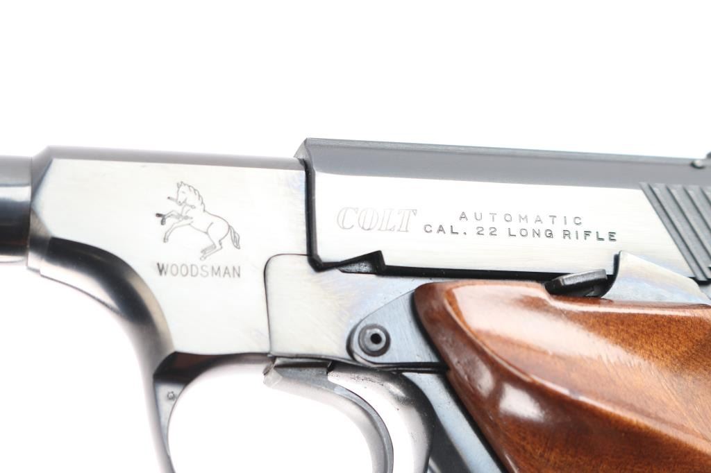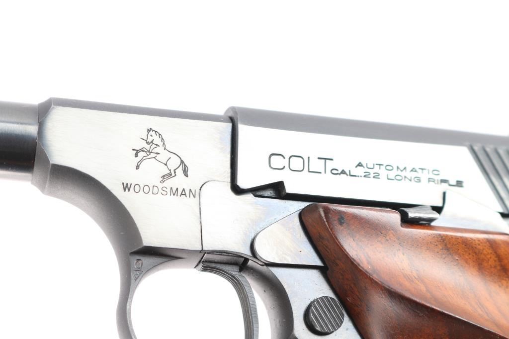 1) #Colt Woodsman .22 LR #81514-S. '2nd Series Sport Model,' pistol chambered for .22 Long Rifle (high-velocity), manufactured circa 1950 in Hartford, CT. Pistol features a gloss blued finish, a 4-1/2" tapered barrel, pinned serrated ramped blade front sight, dovetailed micrometer adjustable square notch rear sight, serrated curved trigger, serrated push-button magazine release, serrated frame mounted manual safety, serrated slide stop, smooth grip straps, lanyard loop on grip heel, and two-piece partially checkered walnut grips with right-hand thumb rest on the left panel. The original blued finish retained is approximately 95% with very light scattered scratches, light scattered edge wear, and edge wear at the muzzle. Metal displays no rust or deformation. The bore is bright with strong rifling and the grips are excellent with very minor handling blemishes. The action is smooth and crisp.