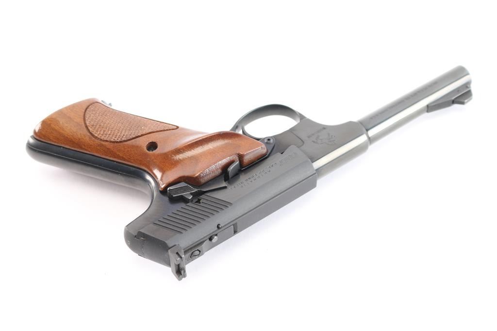 '3rd Series Sport Model,' an American made vintage single-action semi-automatic rimfire pistol chambered for .22 Long Rifle, manufactured circa 1966-1969 in Hartford, CT. Pistol features a gloss blued finish, a 4-1/2" tapered barrel, serrated ramp and pinned blade front sight, dovetailed micrometer adjustable square notched rear sight, smooth curved trigger, latch style heel magazine release, serrated frame mounted manual safety, smooth slide stop, smooth grip straps, and two-piece partially checkered walnut grips with right-hand thumb rest on the left panel. The original blued finish retained is approximately 98% with only superficial scratches. Metal displays no rust or deformation. The bore is bright with strong rifling and the grips are excellent with a few very minor handling blemishes. The action is smooth and crisp. This is a more desired version because of the 4-1/2" barrel length.