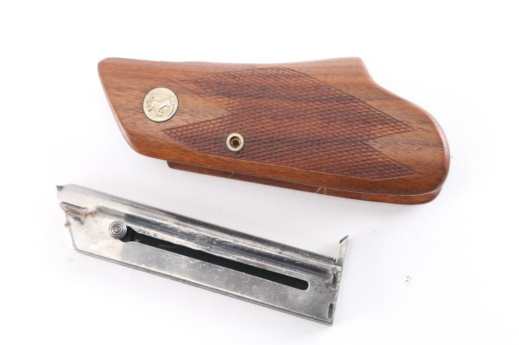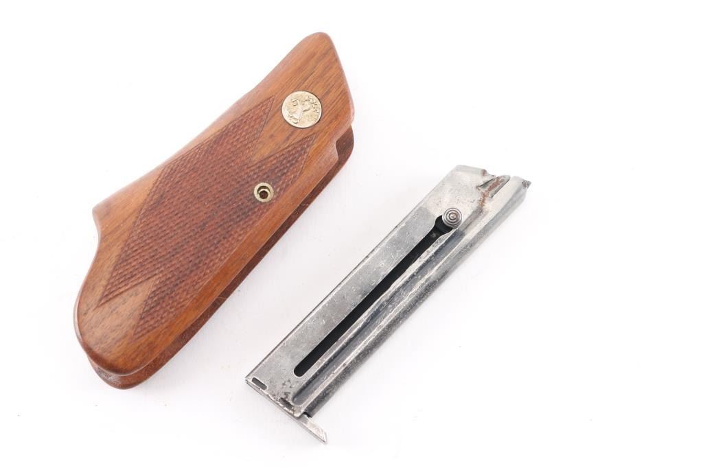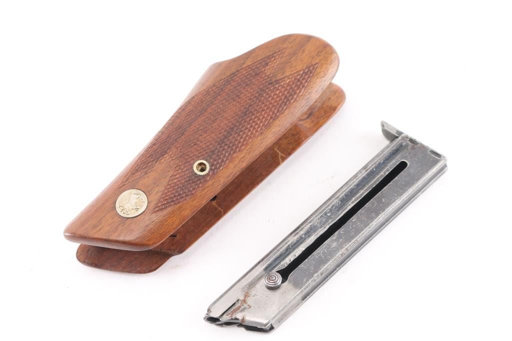 Original two-tone magazine and elephant ear medallion grip for the Colt Woodsman "Bullseye" Match Target First Series. Grip is in very good condition and the magazine is good with wear & some rust, marked "COLT WOODSMAN/CAL. 22 L.R./MATCH TARGET MOD.".