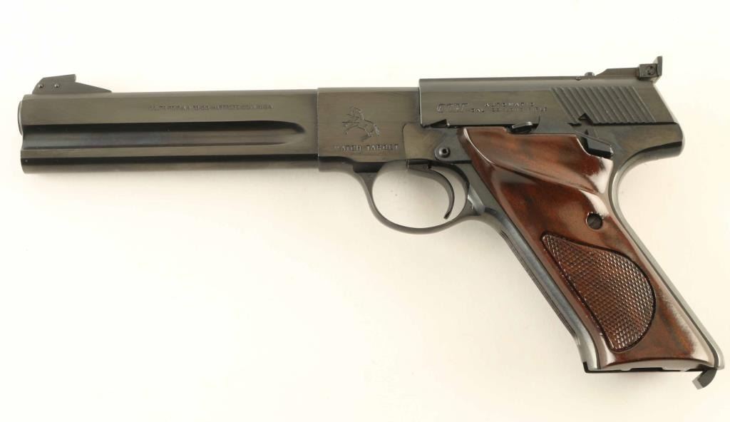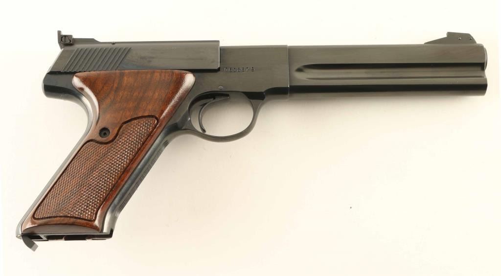 'Third Series' semiautomatic rimfire pistol, manufactured circa 1974. Features blued finish, checkered wood grips with right hand thumb rest, 6" barrel, adjustable sights, heel magazine release, manual safety. Bore is very good condition. Retains 98% blue with few signs of handling or use, few small imperfections in the factory finish noted. Grips are excellent condition. No magazine provided. Condition is NRA Excellent *** Modern Firearm ***