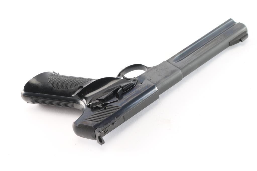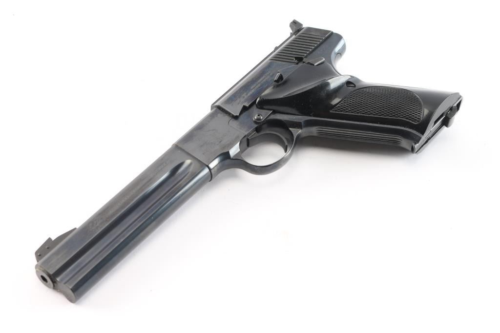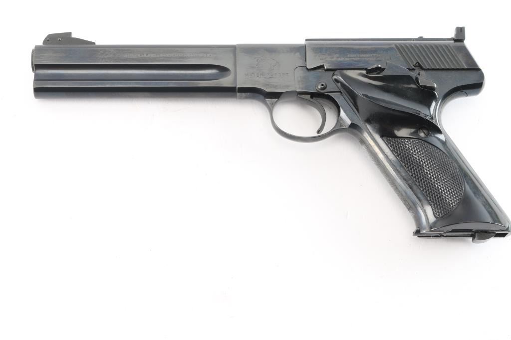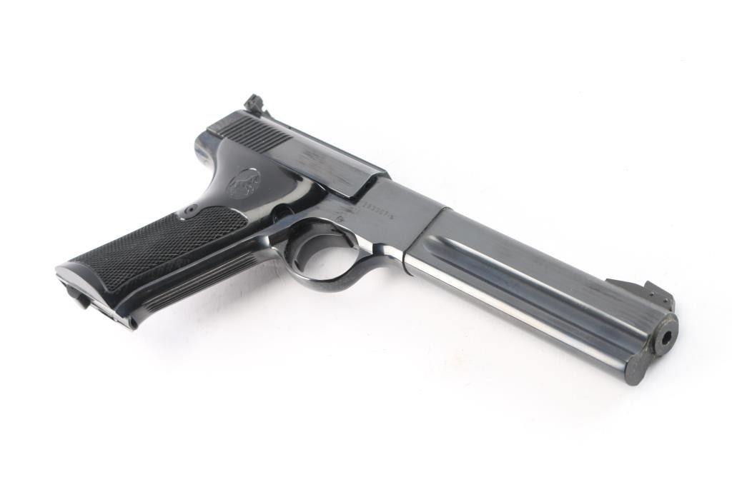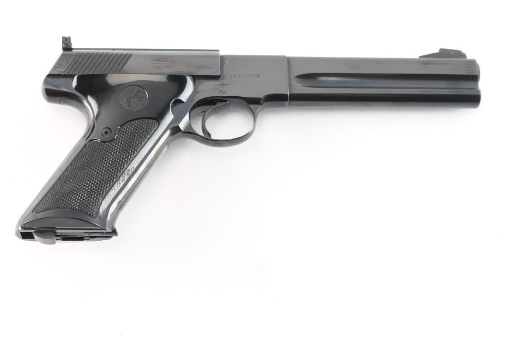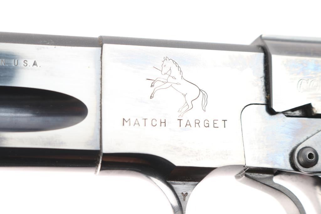 SN: 183367-S. Semiautomatic rimfire pistol manufactured circa 1958, third series match target Woodsman. Features blued finish, checkered plastic grips with thumbrest on the left panel, Rampant Colt on the right panel. 6" lug barrel, pinned Partridge front & adjustable rear sights, heel magazine release, manual safety. Smooth trigger, serrated fore & backstraps. Bore is excellent/bright. Retains 98% original blue finish with slight edge wear. Grips are excellent condition. Markings include "MATCH TARGET" under Rampant Colt. Markings are crisp and even. Colt marked magazine. Has seen very little use.