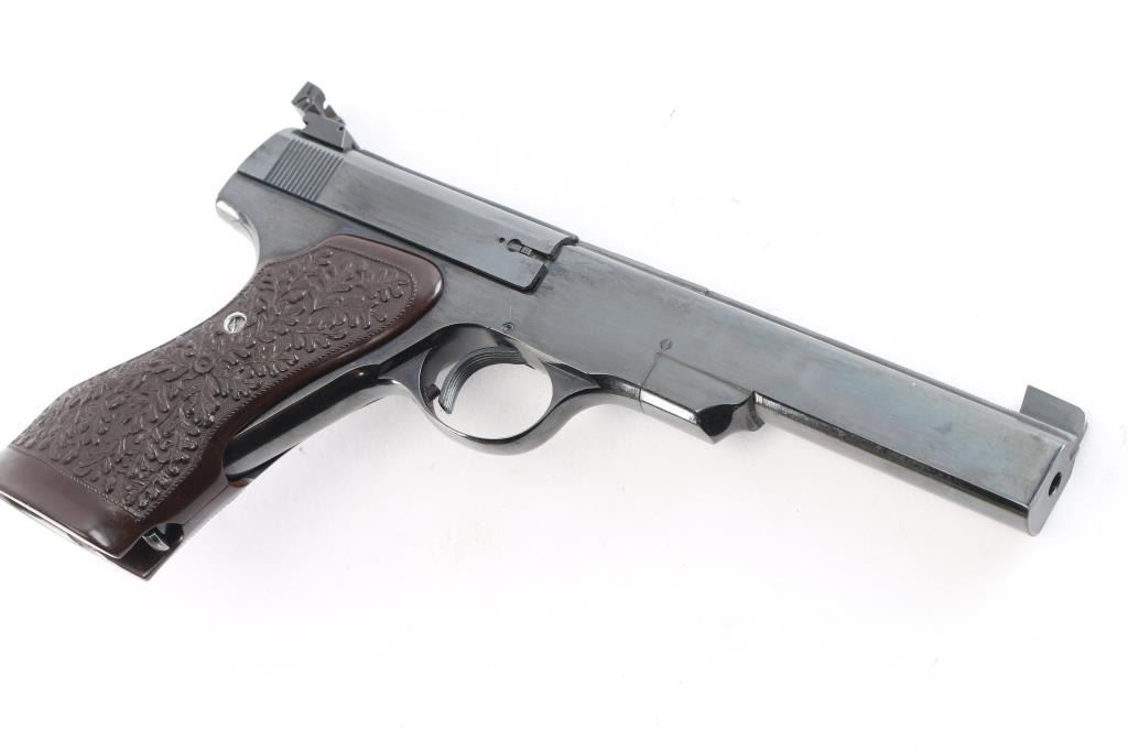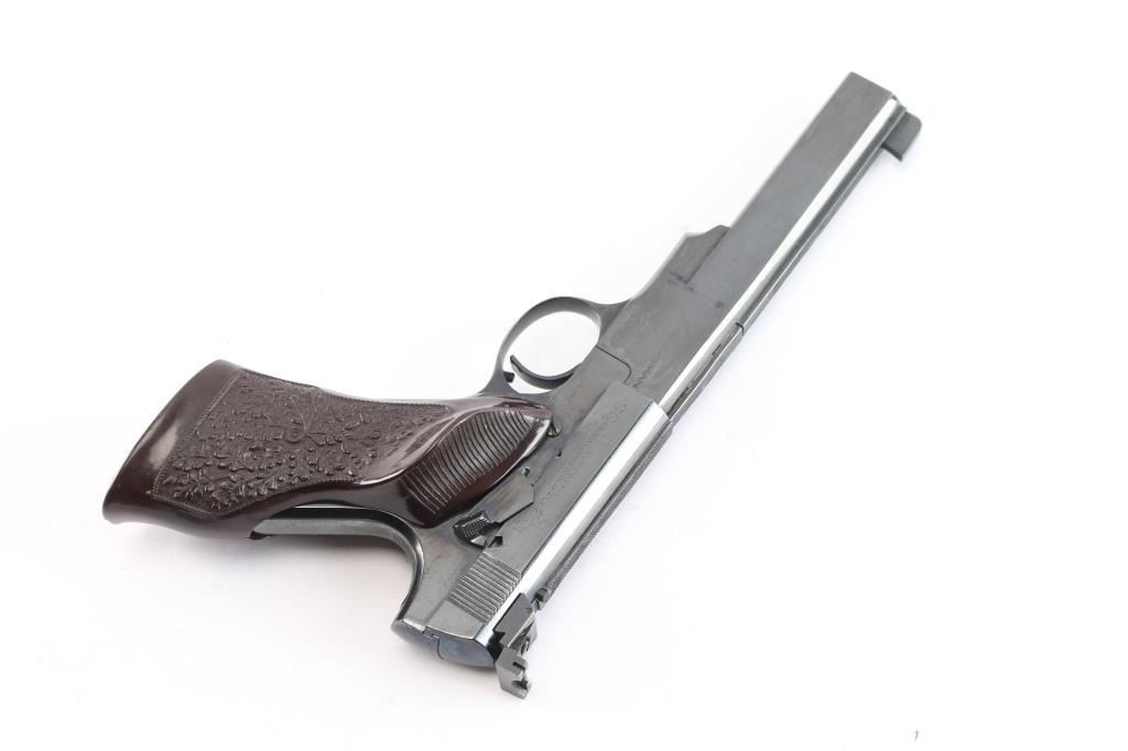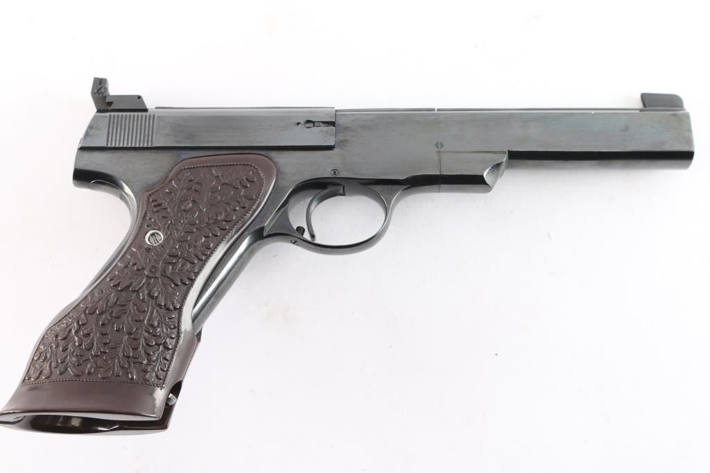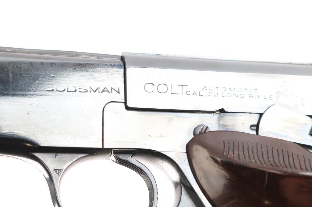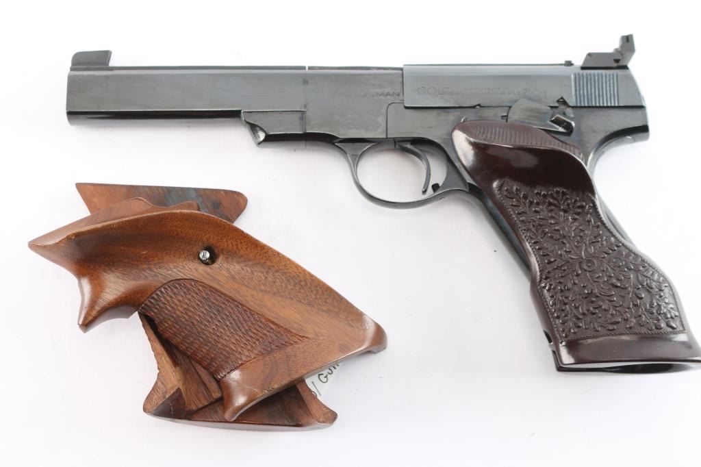Sn: MT11671. This pistol has been re-blued. The Colt Woodsman Match Target (1st Series) features an "MT" prefix in its serial number, produced from roughly June 1938 (MT1) to February 1944 (MT16611). These, along with other Match Target models, are identified by this specific prefix, distinguishing them from other Woodsman series. Manufactured 1941. 5 1/4" slab sided barrel, pinned blade front, micro adjustable square notch rear sights, serrated trigger with adjustable stop, slide stop. vintage “Pointer” stocks from W. Murad of San Carlos California with right thumb rest, oak leaf, acorn motifs. The bore is very good/bright, action is smooth, the slide stop is hard the engage, needs oil, the grips are very good and the re-blued finish about 97% with minor scratches. The 'Rampant Colt' and Colt markings on the slide are clear but the "Woodsman" on the barrel is partially washed out from the re-finish. Comes with the checkered wood, finger rest target grips. One Colt magazine.