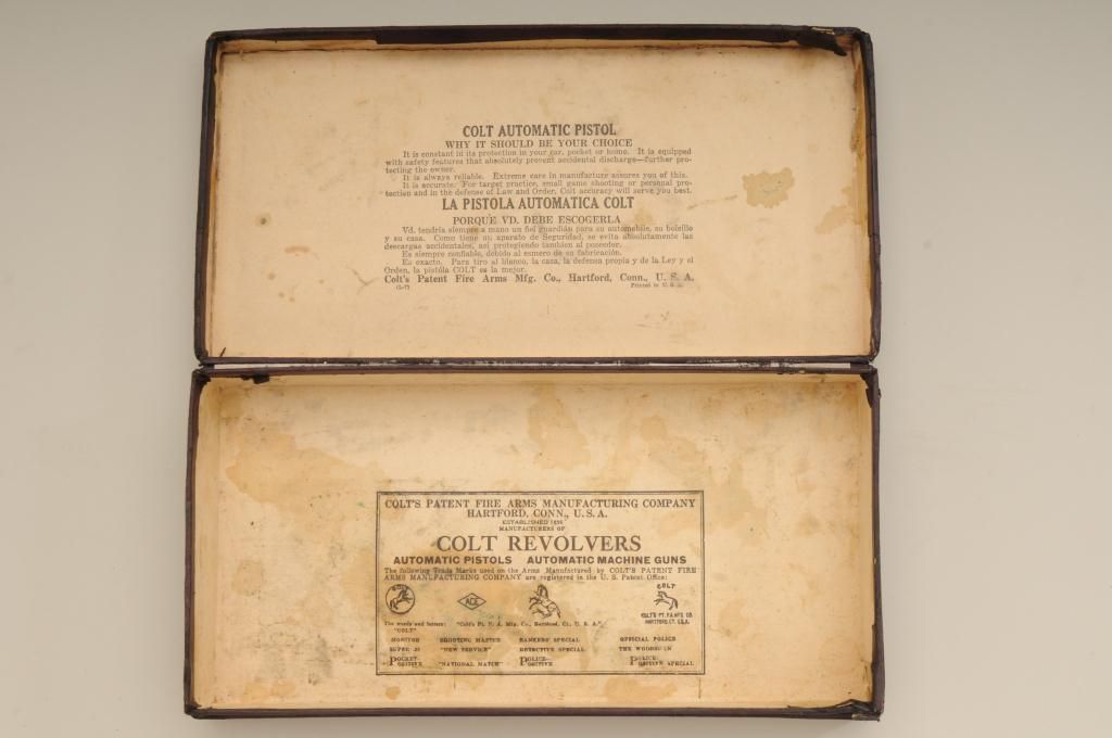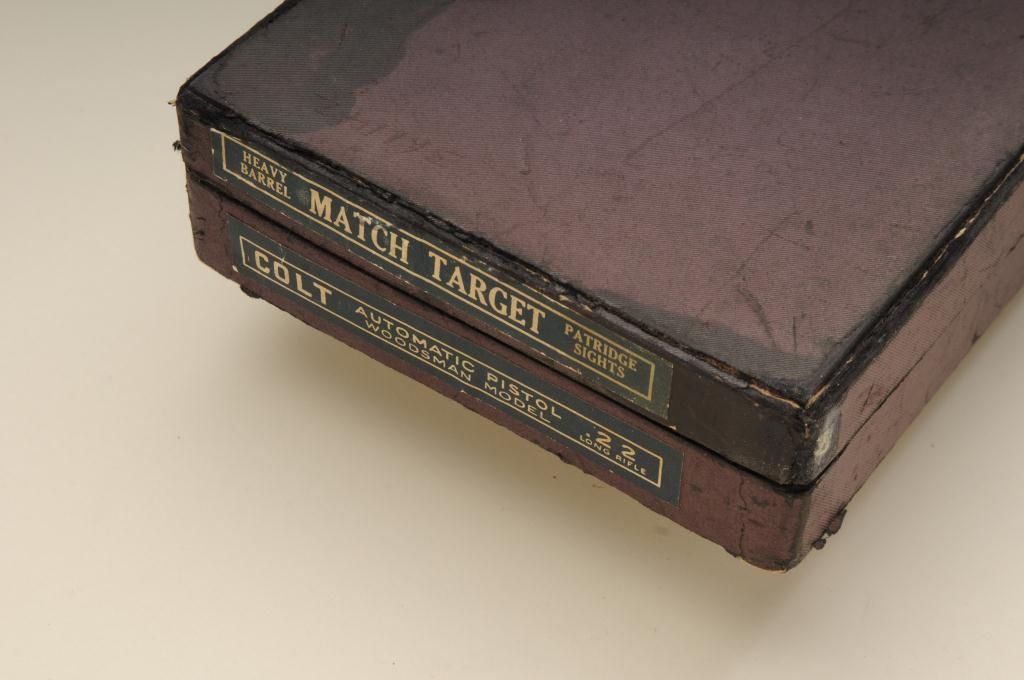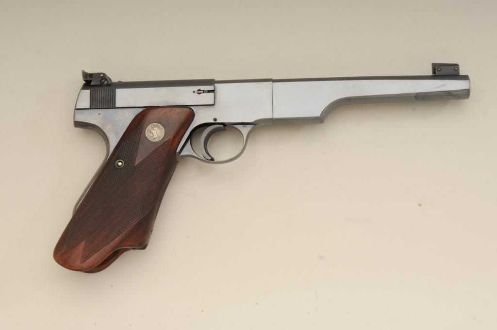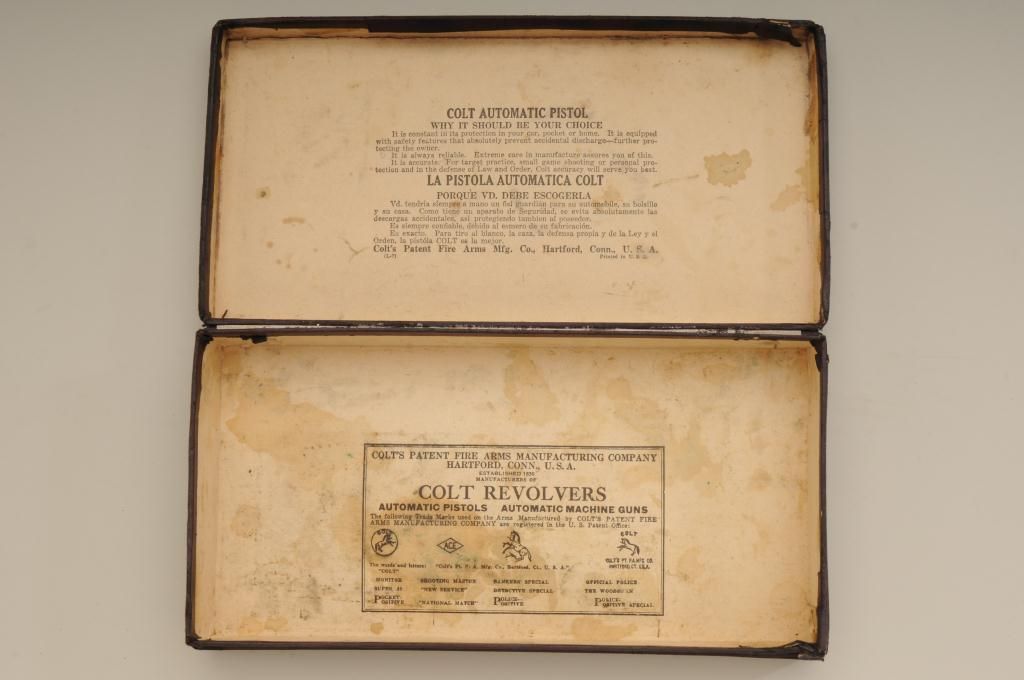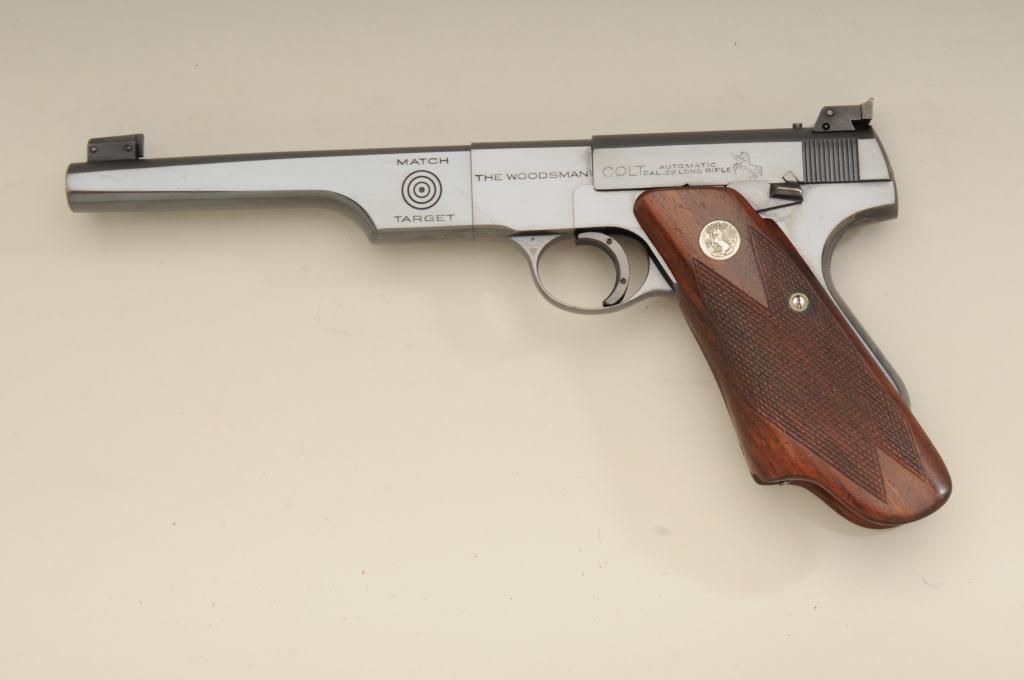 Colt Woodsman Match Target pre-war .22 caliber semi-automatic target pistol with blued finish and checkered “elephant ear” style Roper grips. This Colt retains 96% to 98% original blue with some thinning andslight losses at the edges. There a couple of minor scratches but generally near excellent over all. The grips show some slight handling and minor use also they are very near excellent. The interior shows somefiring but bore is excellent and a trigger shoe has been added but is easily removed by screws. A correct Match Target marked Colt clip is included. The pistol is contained within an original to the period cardboardbox with the instructions and cleaning Rod. The box is good with some repairs, slight tatters and both end labels but the serial number on the bottom of the box is MT5548 and does not match. From the collection of JoeKiser former president of Colt Collectors Association and one of the Western United States most renowned old-time collectors. Est.: $2000-$4000