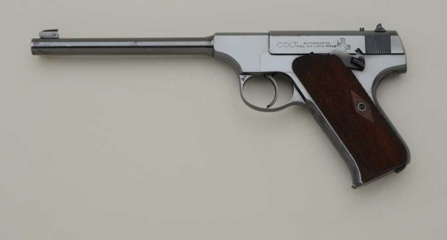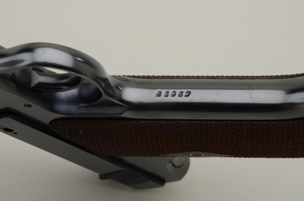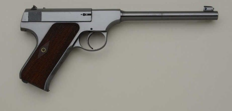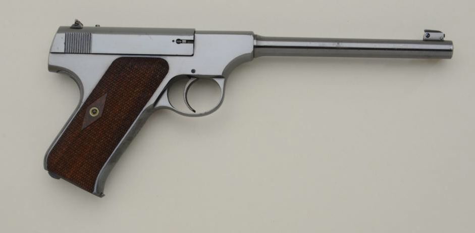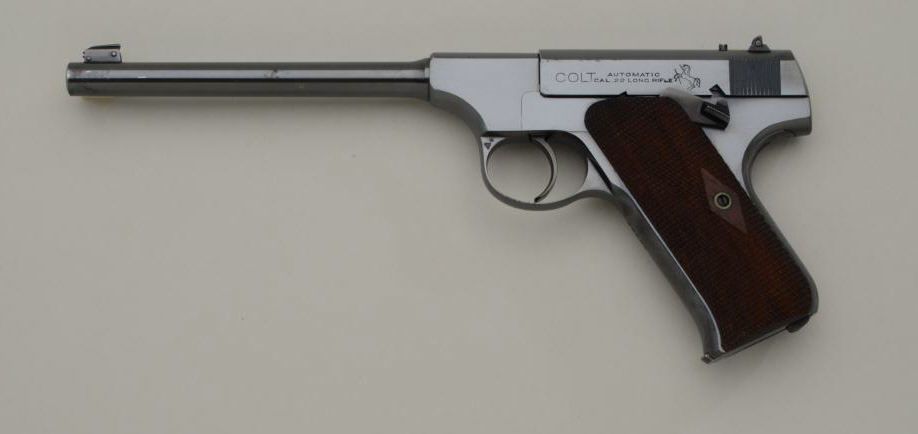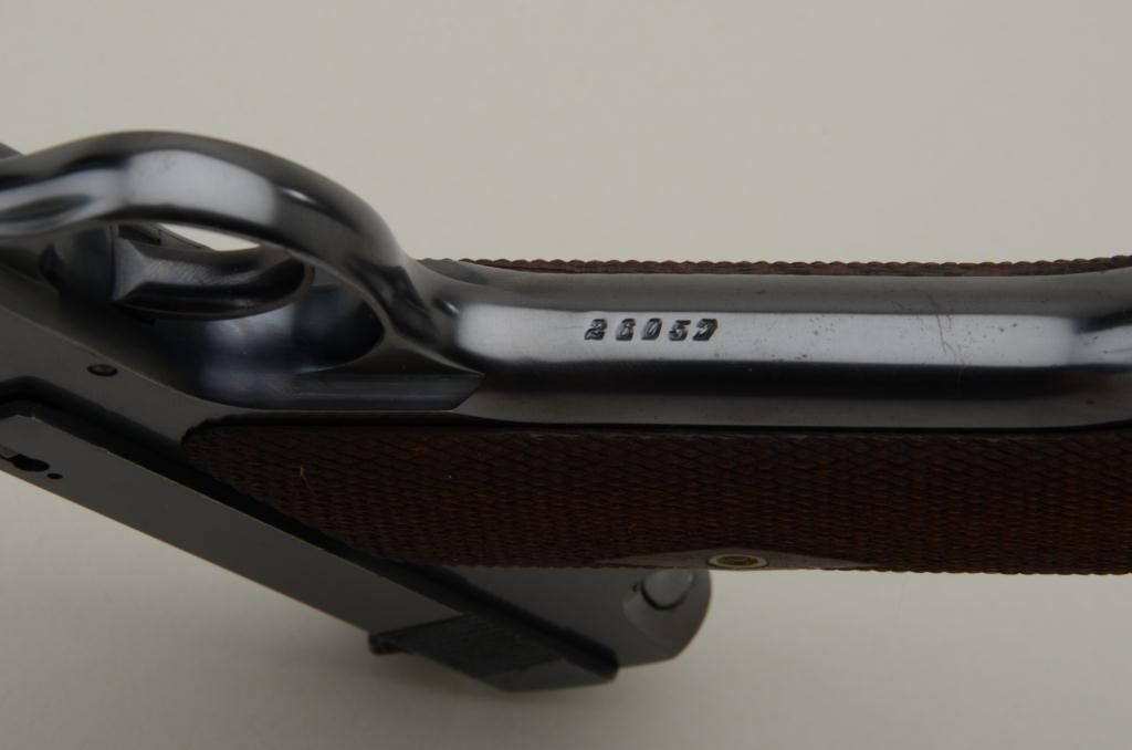 Colt Woodsman Model .22 caliber semi-automatic pistol in fine original condition, serial number 26057 made about 1921 to 1922. The Woodsman retains approximately 96% to 98% original blue withsome slight beginning age at the muzzle and edges of the barrel with some minimal loss of finish. The diamond checkered grips are fine to near excellent also. The interior shows just a little use with a bright bore. Afactory marked Colt two tone clip is included. From the collection of Joe Kiser former president of Colt Collectors Association and one of the Western United States most renowned old-time collectors.Estimate $1500-$3000