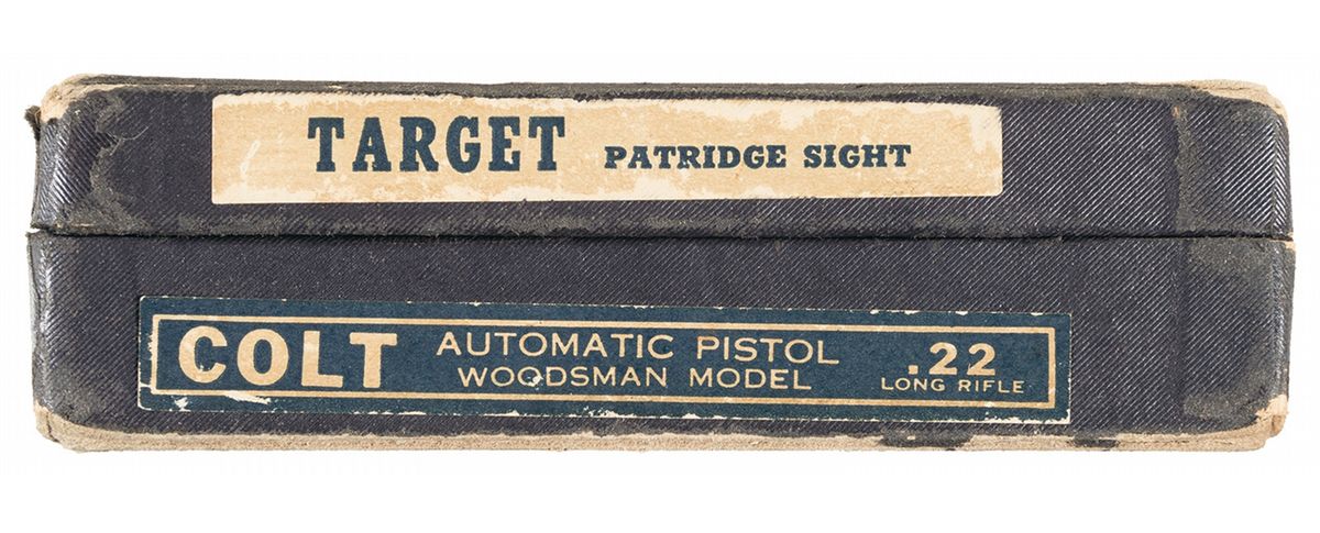 Manufactured in 1952. Has a Patridge front sight on a serrated rib and a fully adjustable rear sight. The left side of the frame is marked with the Rampant Colt logo over "MATCH TARGET". Fitted with a set of checkered walnut grips with right handed thumb rest. With a maroon First Generation Colt Woodsman Target box numbered to another gun.