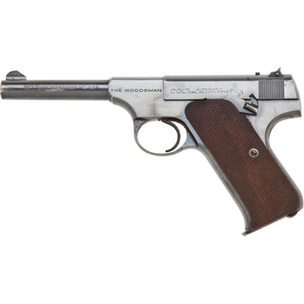 Colt Woodsman Semi-Automatic Target Pistol. Serial no. 113024, .22 caliber, 4 1/2-inch barrel with fixed blade front sight. Blued finish. Checkered factory walnut grips. Hartford address on barrel with 1918 patent date. Dovetailed adjustable rear sight. Magazine marked: "COLT WOODSMAN/CAL.22 L.R." Manufactured 1938. Condition: Very good. Retaining approximately 80-90% original blue with scattered fine scratches and handling wear. Noticeable muzzle wear. Mirror bright bore. Grips good, left panel with carved initials "W/T." Otherwise fine.NRA FIREARMS FOR FREEDOM PROGRAM