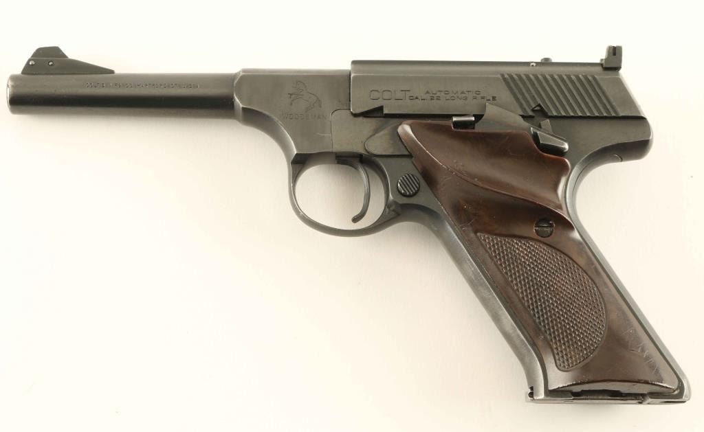 'Second Series' Post-war concealed hammer semi-automatic target pistol chambered for .22 Long Rifle, manufactured circa 1953. Features a blued finish, 4.5" straight taper barrel, fixed blade front sight, adjustable rear sight, serrated trigger, concealed hammer, automatic slide stop, manual safety on the left side of the frame, magazine disconnect safety, push button magazine release, factory 10 round magazine, smooth mainspring housing with integral lanyard loop, steel frame and two-piece checkered Coltwood thumb rest grips with the Rampant Colt insignia molded into the right panel. Pistol exhibits approximately 93% of it's nice blued refinish showing minor imperfections in the metal under the finish and finish loss on the front strap & mainspring housing light muzzle wear. Action is smooth, the bore is excellent and the synthetic grips are good with scattered blemishes. Condition is NRA Very Good as refinished. ***C&R Firearm***