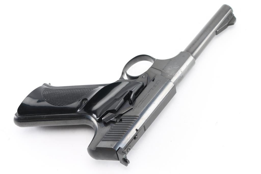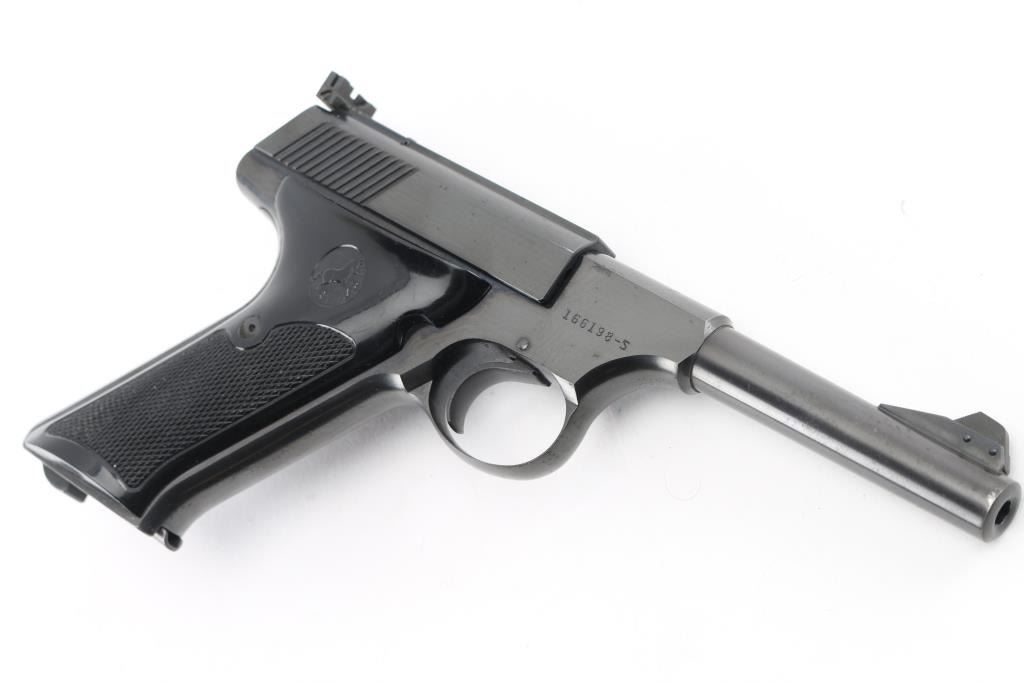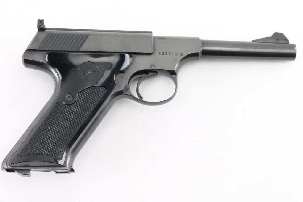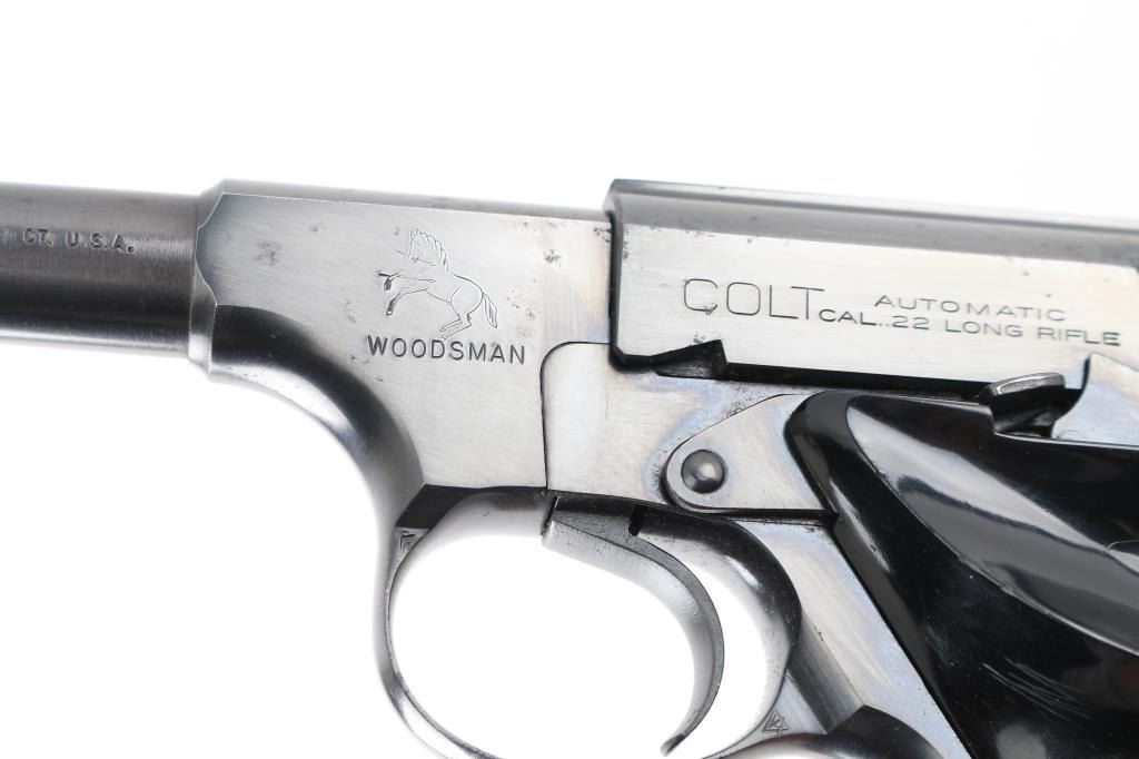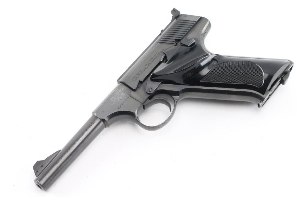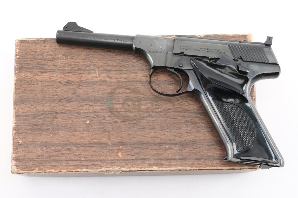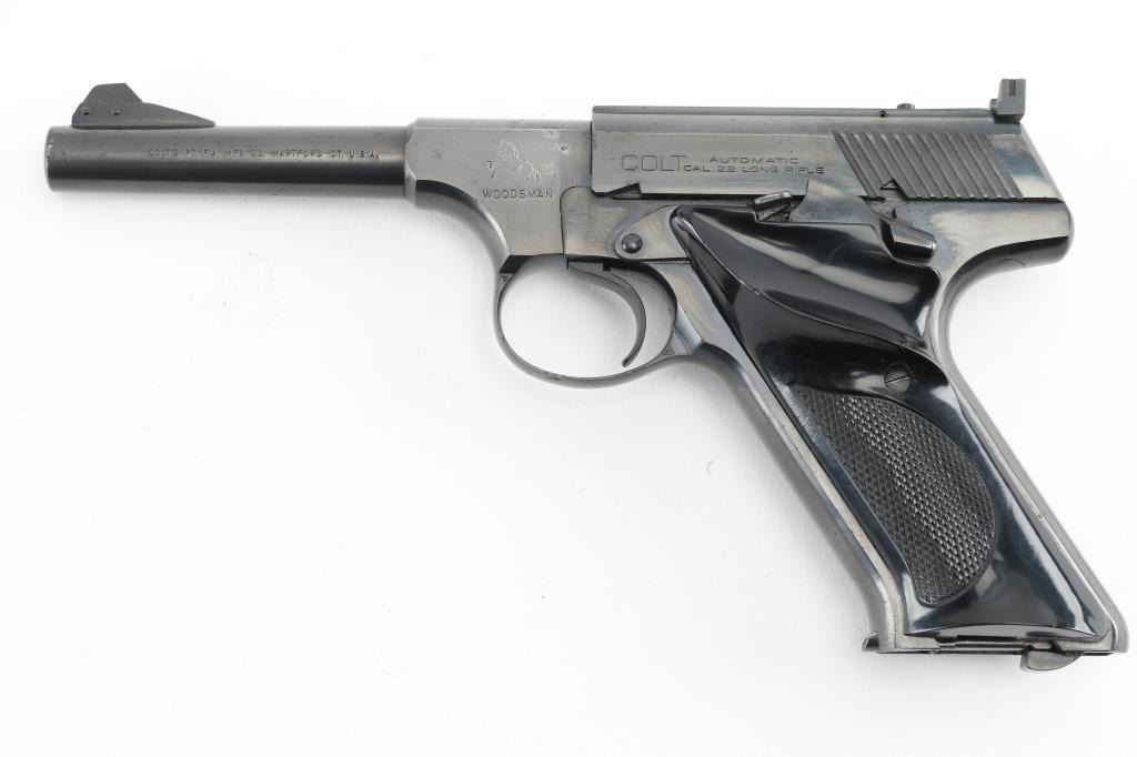 Third Series 'Sport Model' manufactured circa 1956. Features blued finish, checkered thumb rest black plastic factory grips, 4.5" round barrel, adjustable sights, heel magazine release, manual safety. Bore is excellent/bright. Retains 99% blue with slight muzzle wear, and 3 very minor spots of pin-prick pitting by the Rampant Colt on the left barrel. Grips are excellent. Includes one Colt magazine, good condition . All Colt markings are crisp/clear. Comes in the original Colt wood grain box with matching serial number on the bottom, manual, cleaning rod, test target, vintage Colt screwdriver disc. NRA Condition-Very Good. C&R Firearm.