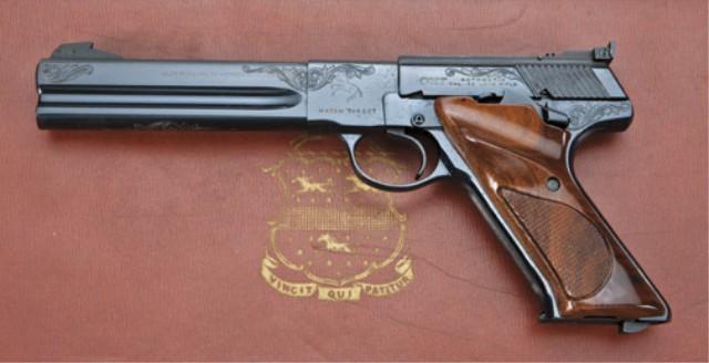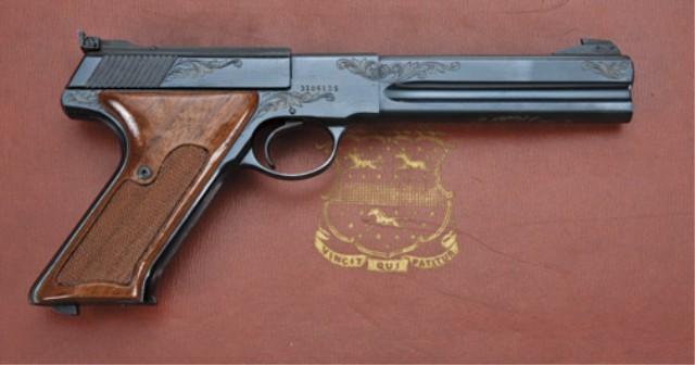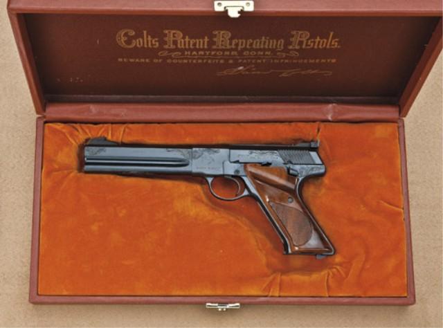 Colt Woodsman match target .22 caliber semi-automatic pistol, factory style A-engraved, blued finish, checkered wood grips, serial #310613S. In Colt custom workshop display case. The pistol shows 99%+ original blue, slight evidence of use, excellent grips, case near excellent. No factory latter available at time of cataloging, but we are confident that this engraving was factory ordered and the pistol shows its original blue and correct matted topstrap and Elliason adjustable sights. From the Robert Petersen Collection. Est: $1,000 - $2,000