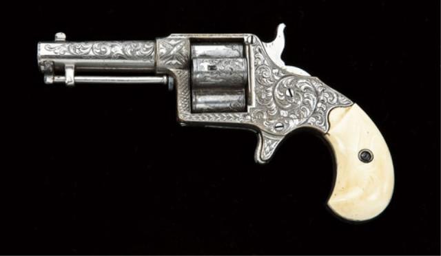 Colt cloverleaf or house pistol, .41 caliber 4-shot, fully and finely deluxe Nimschke style scroll engraved, full nickel plated, serial #1368. The pistol shows 80-90% original nickel with some thinning at the edges and lifting at the cylinder. The cylinder shows some light cleaning where the nickel has lifted. The edges are crisp, the barrel address is sharp. The engraving is well defined. The ivory grips are very good plus and just show some minor aging and slight shrinkage. The frame show some brass showing through the plating. The engraving is extra deluxe and shows the style of L. D. N. himself. There are unusual star and plus markings beneath the cylinder pin, which the engraver probably used for identification. A very exceptional and deluxe engraved cloverleaf. Est: $7,000 - $14,000