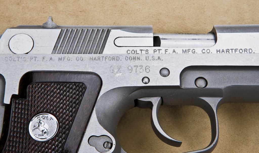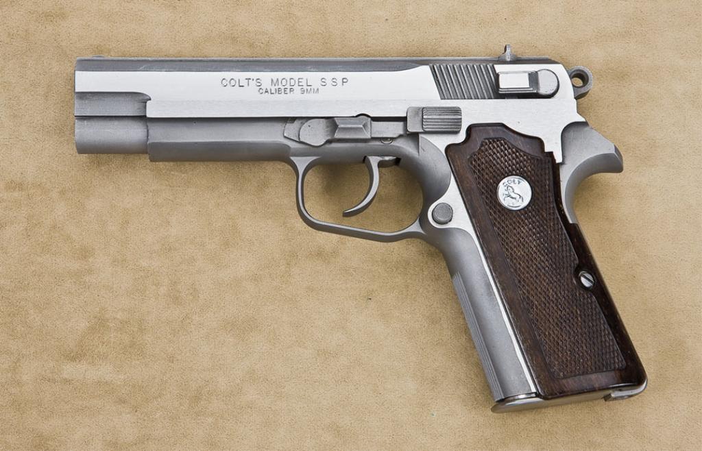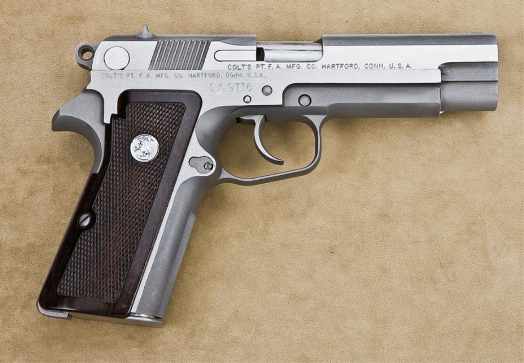Colt experimental model SSP, 9mm double-action semiautomatic pistol, 14-round staggered magazine, stainless steel construction, impressed checkered Colt medallion grips, serial number “GX9736. Made for military tests with documentation and manual detailing the specifications and characteristics of this test piece. The pistol remains in near fine condition showing some slight scratches, handling, minor use from testing. Interior shows firing but near excellent overall. One of a few in private hands and never offered for sale on the commercial market as a production model. Note: 14-round magazine cannot be delivered to California residents. Consignor will ship magazine to successful legal buyer in other 49 states. California purchasers can purchase the firearm, but no magazine will be supplied. Est: $6,000-12,000