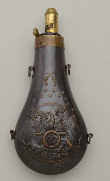 Colt flask for revolving Root shotgun marked American Cap and Flask Co. on spout showing adjustable four stage charger and remaining in very good plus to near fine original condition. The flask shows 75% to 85%original lacquer on the front or embossed side and approximately 30% on back or plain side. The spring shows most of the original blue and top ring of flask is unmolested and all carrying rings are retained. Anexceptional Colt accessory with just a few minor dings on the backside and a beautiful embossed front. Est.: $900-$1,800.