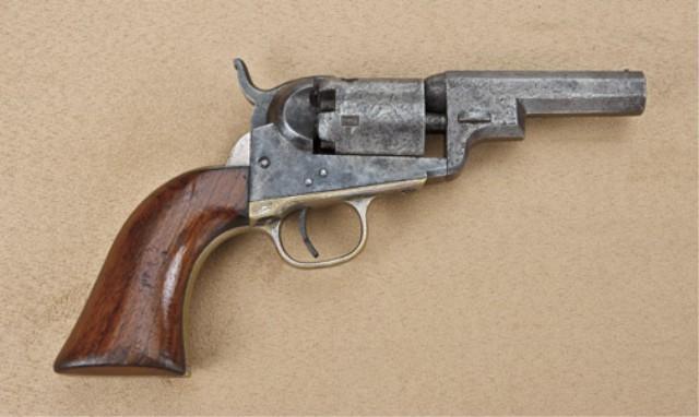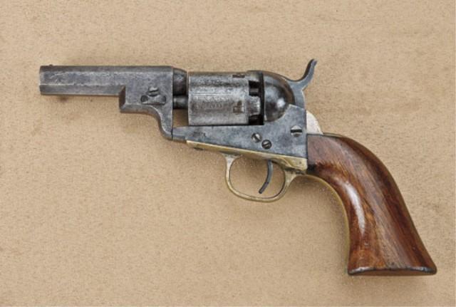 Colt model 1849 pocket model, .31 caliber percussion, 3” barrel, no rammer, so called “Wells Fargo” variation, serial #122093. The revolver remains in good original condition showing a grey to brown original finish, some scattered light to moderate erosion and some slightly heavy pitting on cylinder and breech of barrel. The cylinder shows 20-30% cylinder scene, the edges show some wear at the muzzle and there are some dings and mars toward the forward left front of barrel. The barrel address is good, Colt’s patent marking good on frame and cylinder. The backstrap and triggerguard show 20-30% original silver. The grips are good with 40-60% varnish, normal wear at the edges, slight scratches, minor imperfections. All matching visible serial numbers, good action, fair to good interior. The revolver is absolutely original and shows the small “8” beneath the serial number, frame, and backstrap, which is commonly found on the Wells Fargo variation and experts agree it was some sort of factory designation for the 3” pocket or Wells Fargo, but no exact determination of why the number “8” was used. A scarce to rare variation with estimates of approx. 500 – 1,000 produced. Est: $1,500 -
