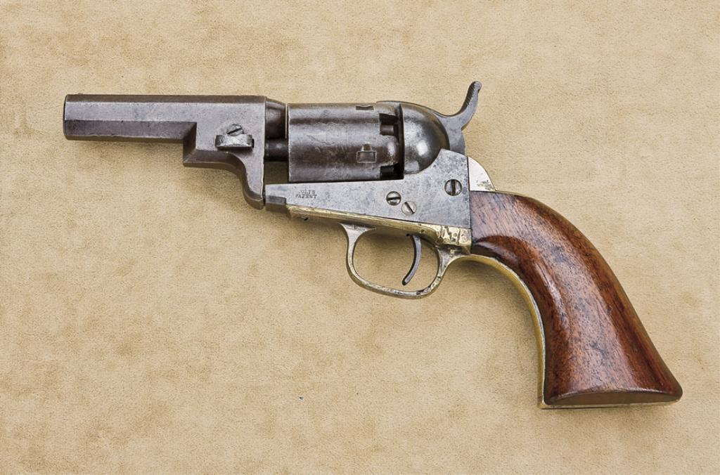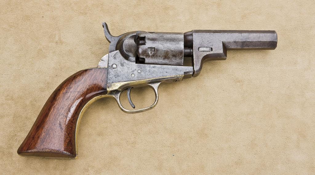 Colt model 1849 pocket model, .31 caliber percussion, with factory 3” barrel, no ramrod, often identified as “Wells Fargo model”. Serial number “122206”. The revolver remains in good to very good original condition showing generous cases of blue and case hardening mixing in the patina. There is some spotting and scattered light erosion and surface pitting, normal aging. The cylinder shows 30-40% light stagecoach hold-up scene. The backstrap and trigger guard show 30-40% original thick silver plate, and there are some dings and mars from contact on edges of trigger guard and butt. The varnish wood grips are very good plus with 60-70% original varnish, some wear at the edges, some slight dings, mars, scratches, and just normal aging. Good markings, all matching visible serial numbers. Good action, good overall. The pistol shows the “8” beneath the serial number on the frame, trigger guard, and backstrap, which is a peculiarity of this model. The barrel is not quite setting well on the pins and it shows a slight gap from being pried. With DuPont inventory sheet, purchased by him in 1983 in case, which is now separated. Est: $2,500 - $5,000