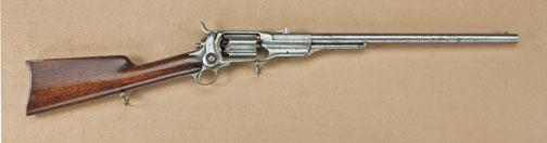Colt model 1855 .56 caliber 5-shot revolving carbine with factory 21” barrel, grey patina finish, cartouche wood stock, serial #859. Refer Flayderman 5B-082. The gun remains in good original condition showing a lightly cleaned grey patina finish, some scattered light to slightly heavy pitting and erosion, the heaviest pitting on the cylinder and some spots on the barrel. The markings on the cylinder and tang are visible, the marking are the side of frame are not visible. The rear sight is a correctly-made replacement, the stock is good with visible cartouche on left wrist, some mars and scratches, and a light coating of varnish or shalack, but no sanding- with a good wood to metal fit. The action is not quite working properly and needs some minor adjustment. The original sling swivels are retained. There is also a small “P” inspection at the rear top of barrel and junction of frame. Martially-marked Civil War specimens are quite scarce, approaching rare. Est: $2,000 - $4,000