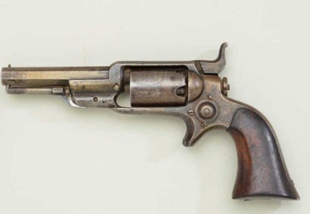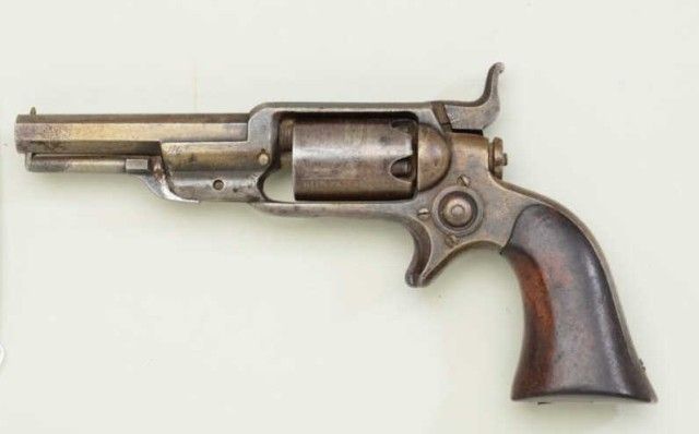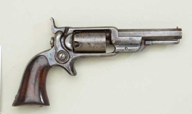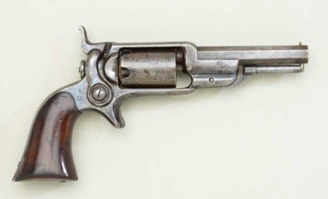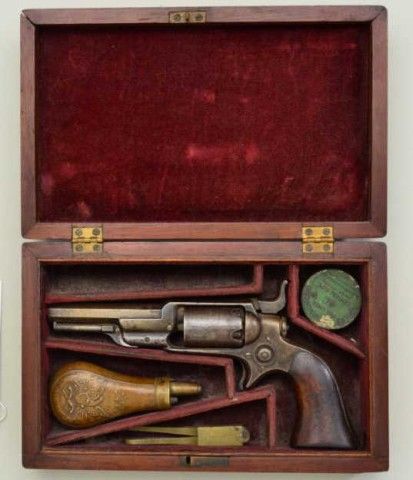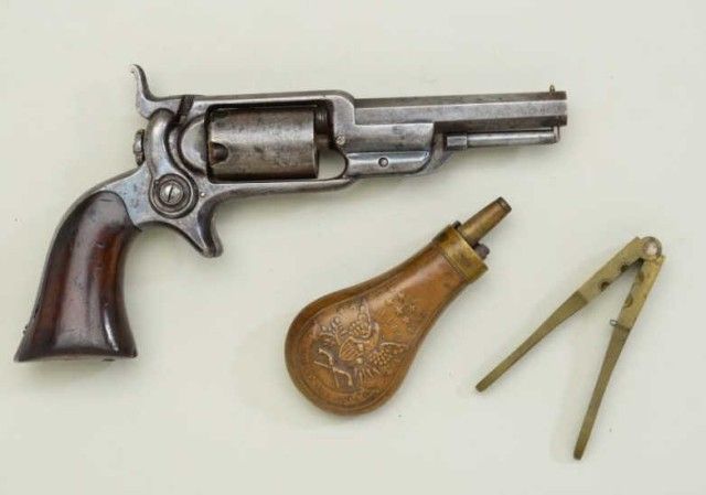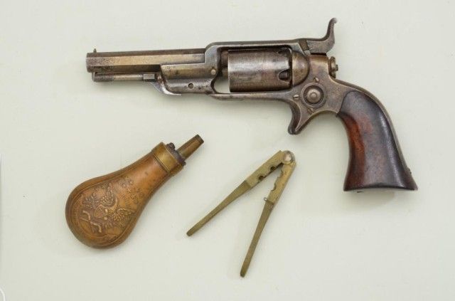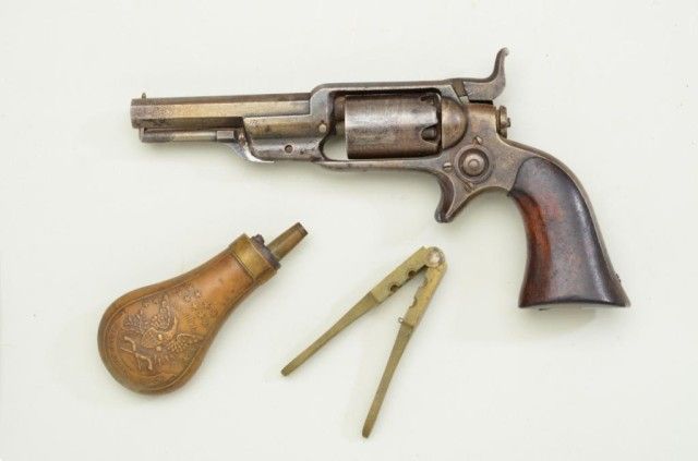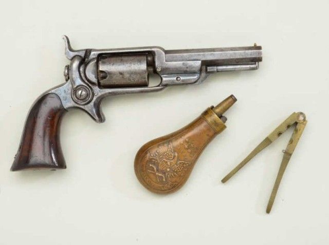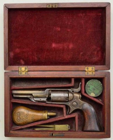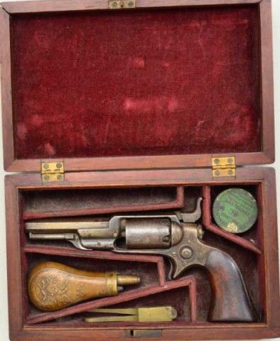 Colt, model 1855 Root .28 caliber percussion pistol with 3 ½” octagon barrel, second variation, serial #13293. The revolver is contained within an old partition style velveteen lined period case. The pistol shows traces of original blue drifting to brown, 50% light cylinder scene and visible Colt’s patent. The barrel address is sharp, the action is not working and main spring is broken. The lining of the case is good withnormal fading and fraying. The small eagle flask is good other than a broken spring and missing thumb piece. A brass .28 caliber non Colt mold is included. The case is good. From an old N.Y. collector’s estate. Est.;$900-$1,800.
